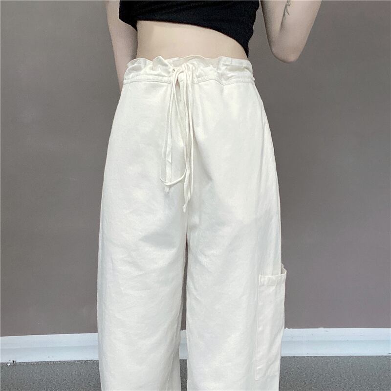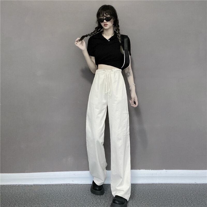 ワイドレッグパンツ レディース夏服スタイル韓国ファッションハイウェストウェストポケットルーズカジュアル 夏物 ワイドパンツ ウエスト コーデ モノクロ Studio84477195548