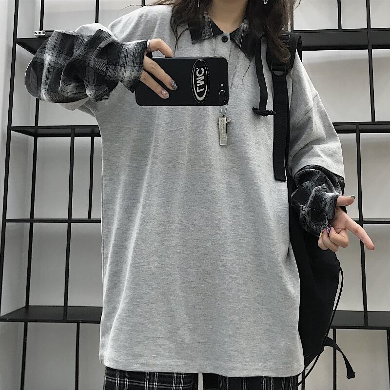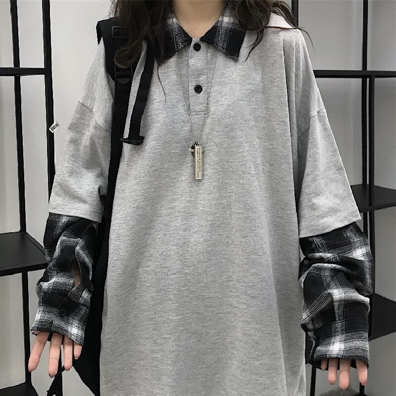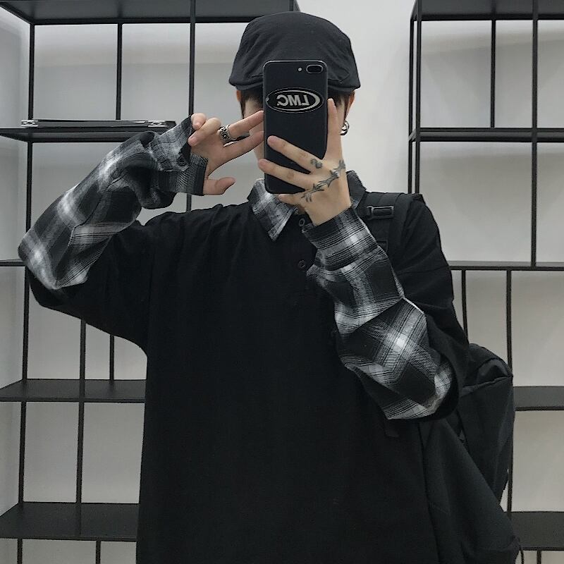 秋物韓国ファッショントレンドスタイルスタンダード格子柄カラーツーピースカジュアルルーズメンズレディース ロング レトロ シャツ 原宿 オータム Tシャツ ステッチ 長袖 Studios16640008551 | pLegLad Studios