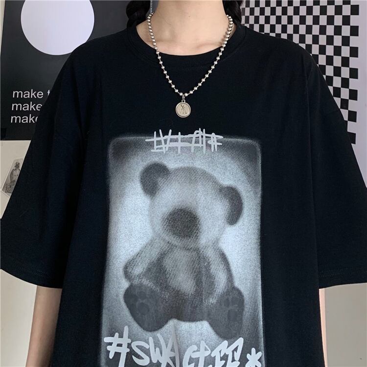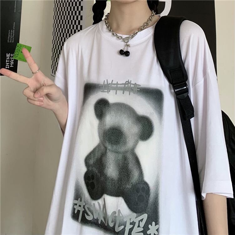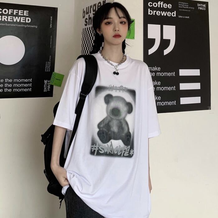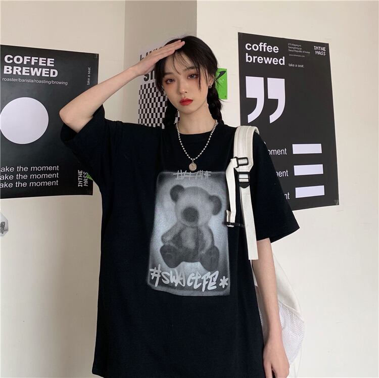 Tシャツシャツ トップス レディース夏服韓国ファッショントレンドスタンダードプリント柄ルーズゆったり レトロ 夏物 ボーイズ スタイル コーデ モノクロ Studio9594327169
