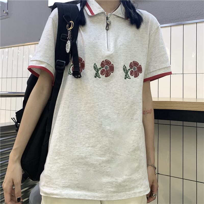 カラーTシャツレディース夏服韓国ファッショントレンドスタンダードFlowerデザイン ラウンドネックトップス レトロ 夏物 Oネック フラワーデザイン ボーイズ スタイル コーデ モノクロ Studio98792431499 | pLegLad Studios