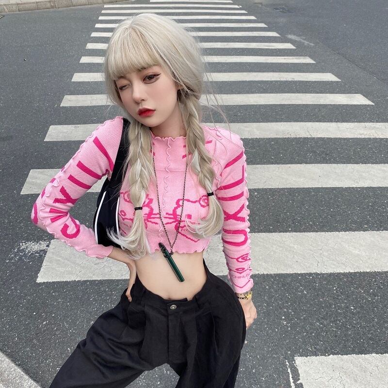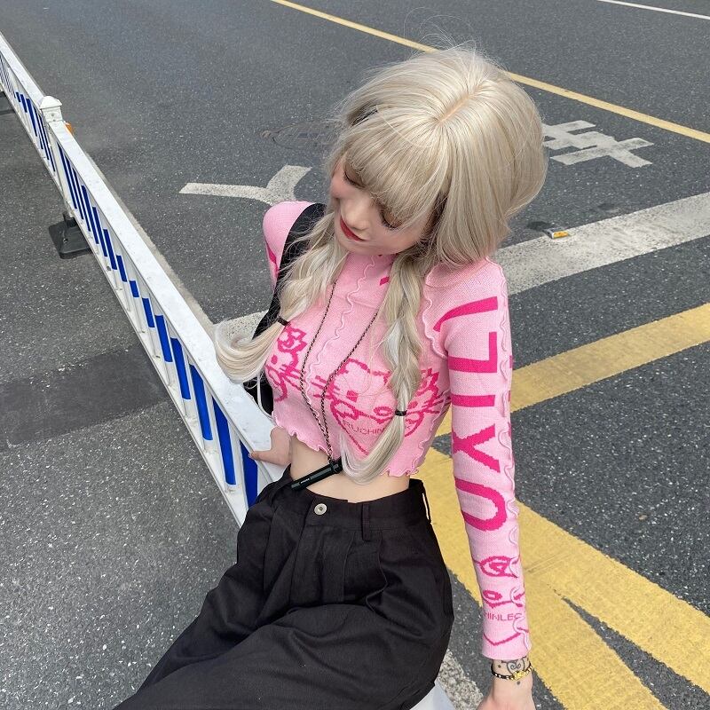 ショートニットセーター トップス レディース夏服韓国ファッショントレンドスリムTシャツ ロング ピンク 大人ガーリー スウィート キュート カジュアル 夏物 スタイル 長袖 Studios20330006302 | pLegLad Studios