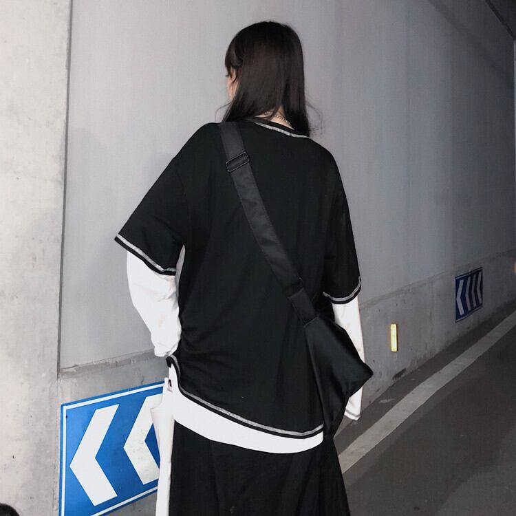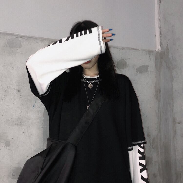 ブラウス レディース秋物ルーズ韓国ファッションラインプリントTシャツ ロング オータム スタイル 長袖 コーデ モノクロ Studio38701461326