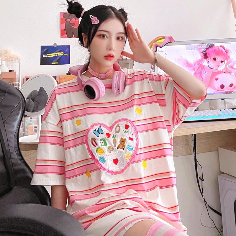 刺繍Tシャツ夏服韓国ファッショントレンドストライプトップス ピンク 夏物 ボーイズ スタイル コーデ モノクロ Studio95782188683