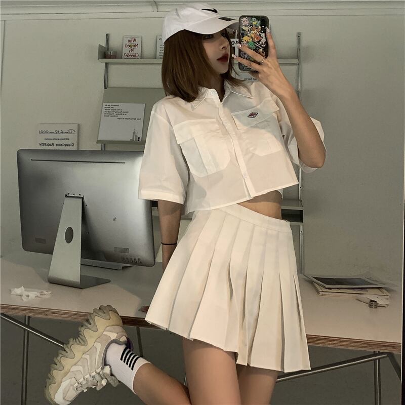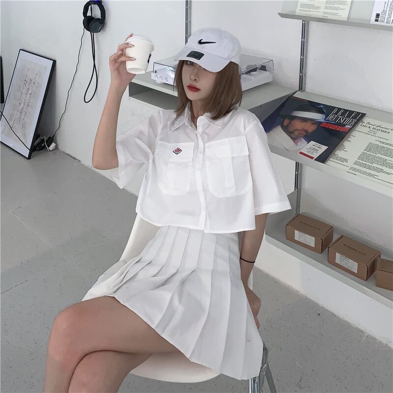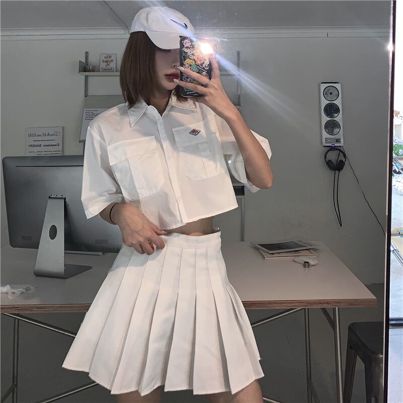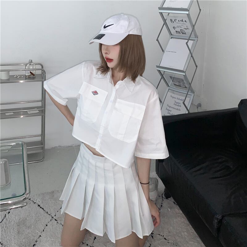 ハイウェストウェストスリムショートシャツ レディース夏服韓国ファッショントレンドルーズ半袖スリーブ ハーフスリーブ 夏物 スタイル ウエスト コーデ モノクロ Studio19141502618 | pLegLad Studios