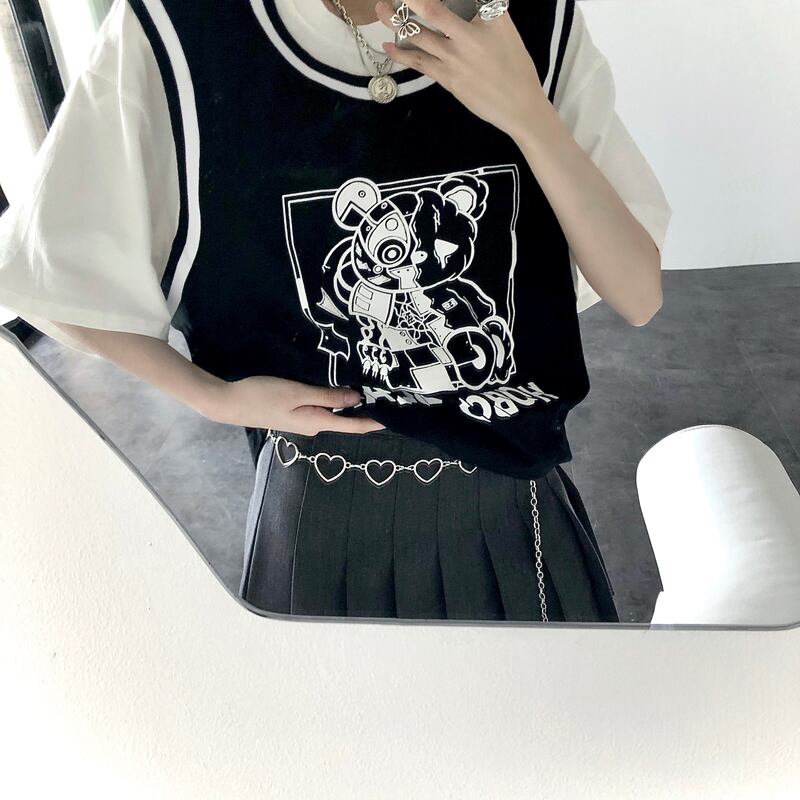 夏服韓国ファッショントレンドツーピーススタンダードプリント柄ルーズカジュアルTシャツトップス レディース レトロ 夏物 スタイル コーデ モノクロ Studio90307814234