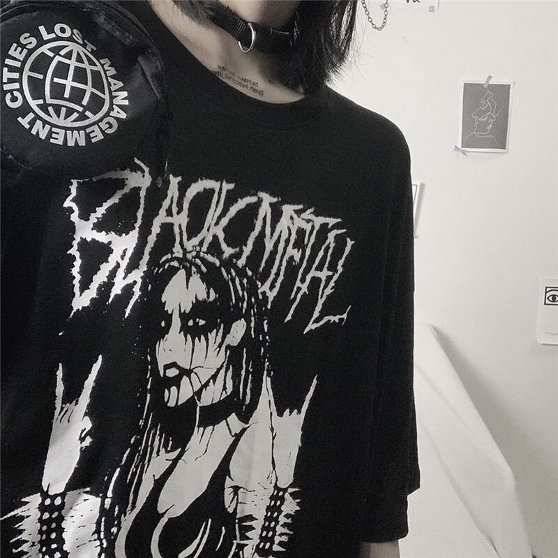 ブラックカジュアルトップス Tシャツシャツ 夏服韓国ファッショントレンドダークプリントルーズゆったり 夏物 スタイル コーデ モノクロ Studio37316921624