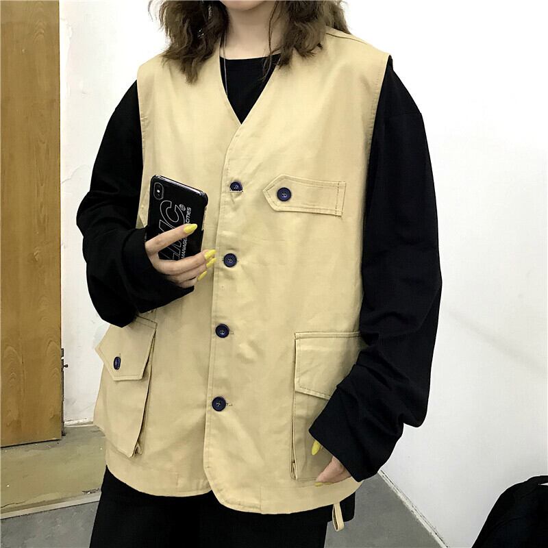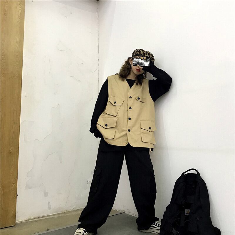 レディース韓国ファッショントレンドスタイルスタンダードルーズノースリーブVネック レトロ 原宿 ポケット多め マルチポケット ウエスト Studios25069792060 | pLegLad Studios