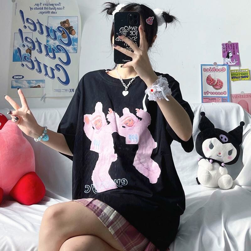 ブルーTシャツシャツ レディース夏服韓国ファッショントレンドスタンダードプリントルーズカジュアルゆったり レトロ 夏物 スタイル コーデ モノクロ Studio84100607217