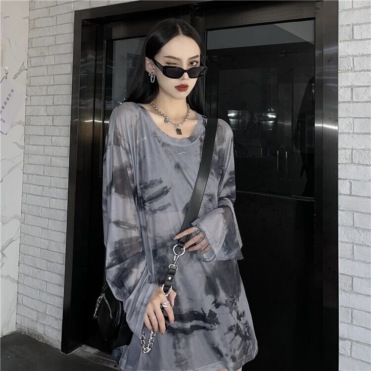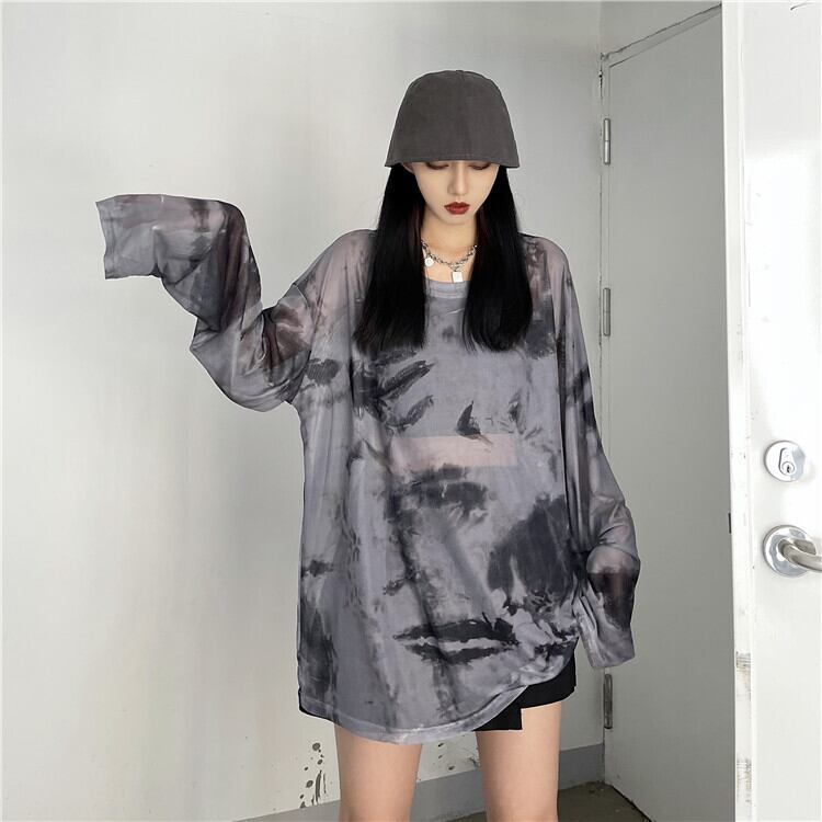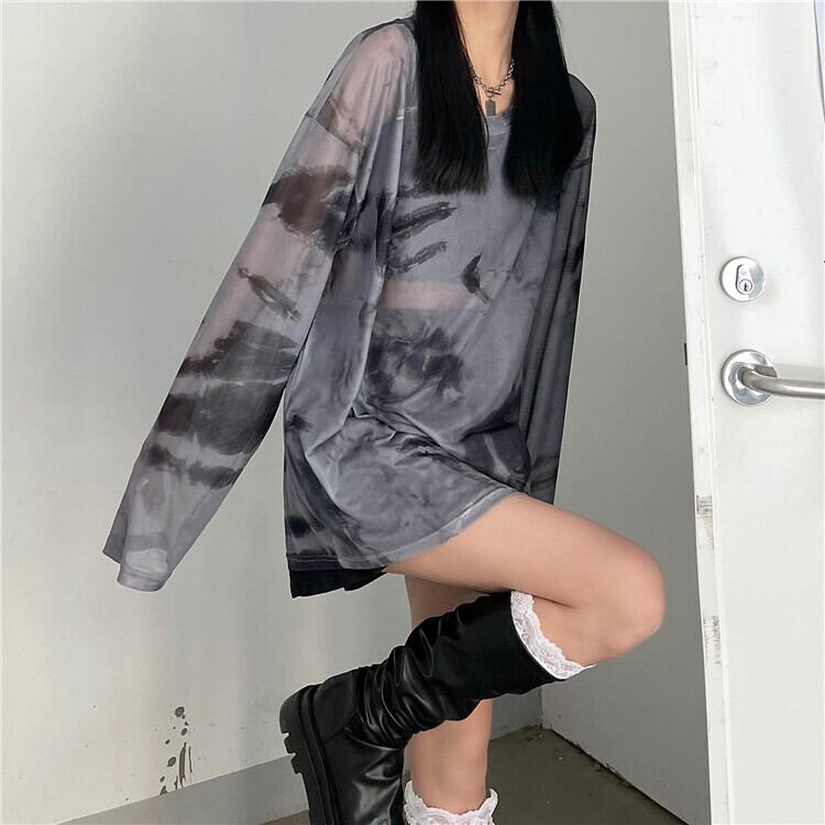 夏服韓国ファッショントレンドルーズメッシュTシャツレディース ロング 夏物 スタイル 長袖 コーデ モノクロ Studio76678067376