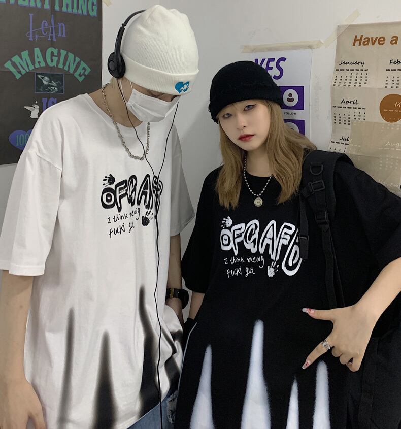 ルーズTシャツレディース夏服韓国ファッショントレンドプリントラウンドネックトップス ストリート 夏物 Oネック スタイル コーデ モノクロ Studio26284462114 | pLegLad Studios