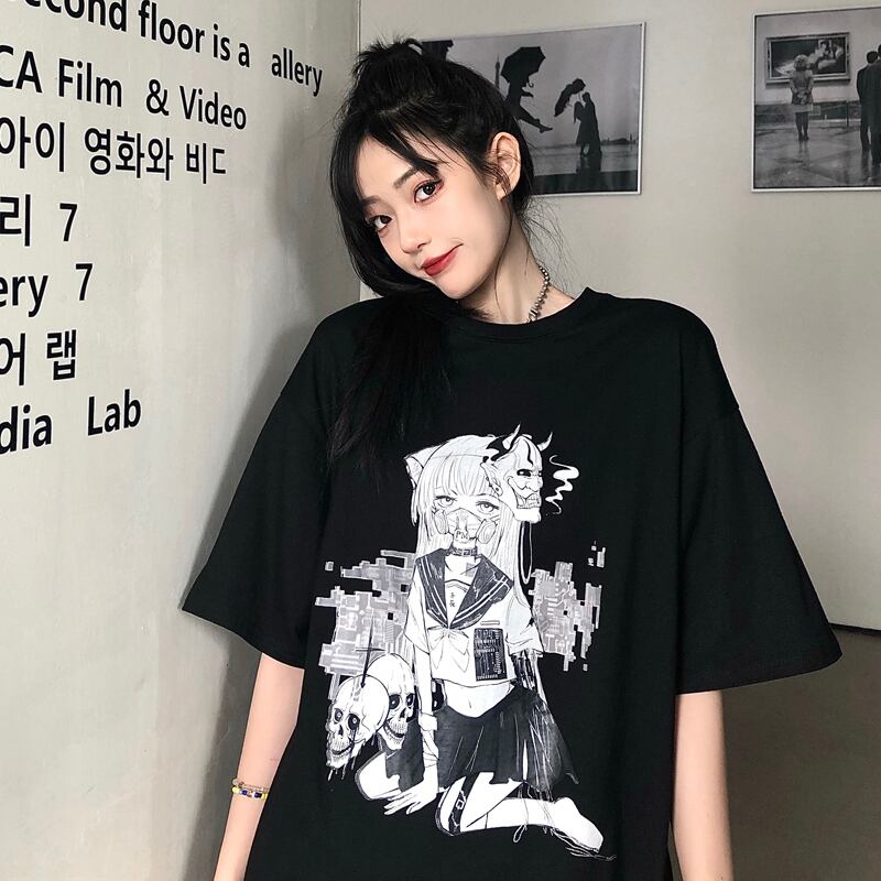 ブラックゆったりシャツ 夏服韓国ファッショントレンドプリントルーズカジュアルTシャツ 夏物 スタイル コーデ モノクロ Studio34384863295