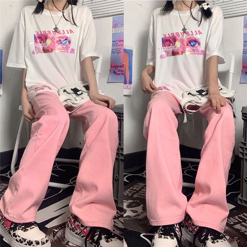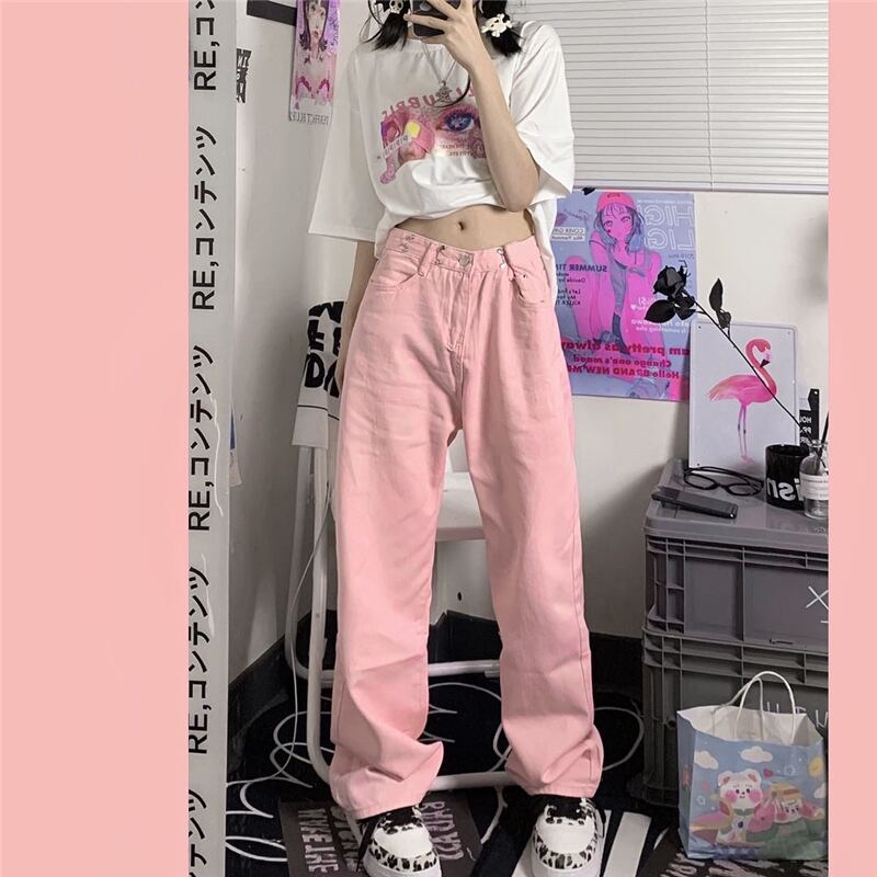 ジーンズ レディース夏服韓国ファッショントレンドハイウェストウェスト薄手ルーズワイドレッグパンツ ピンク ストリート 夏物 ワイドパンツ スタイル ウエスト Studios79082597661 | pLegLad Studios