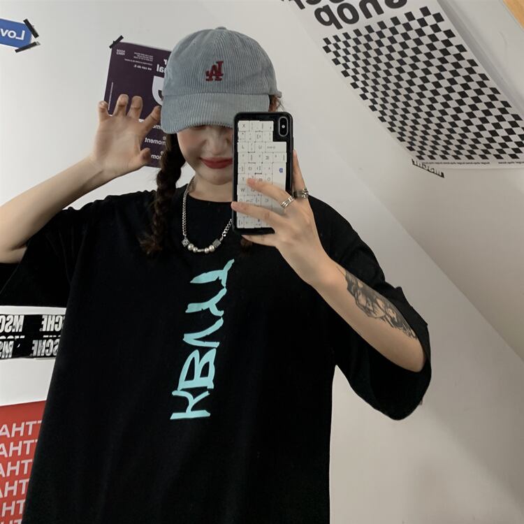 ブラック夏服トップス レディース韓国ファッショントレンドプリントルーズラウンドネックTシャツ 夏物 Oネック スタイル コーデ モノクロ Studio50095240005 | pLegLad Studios