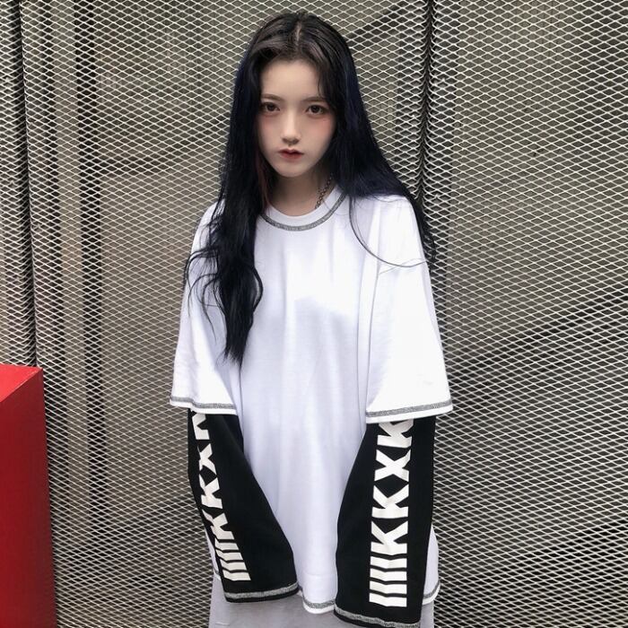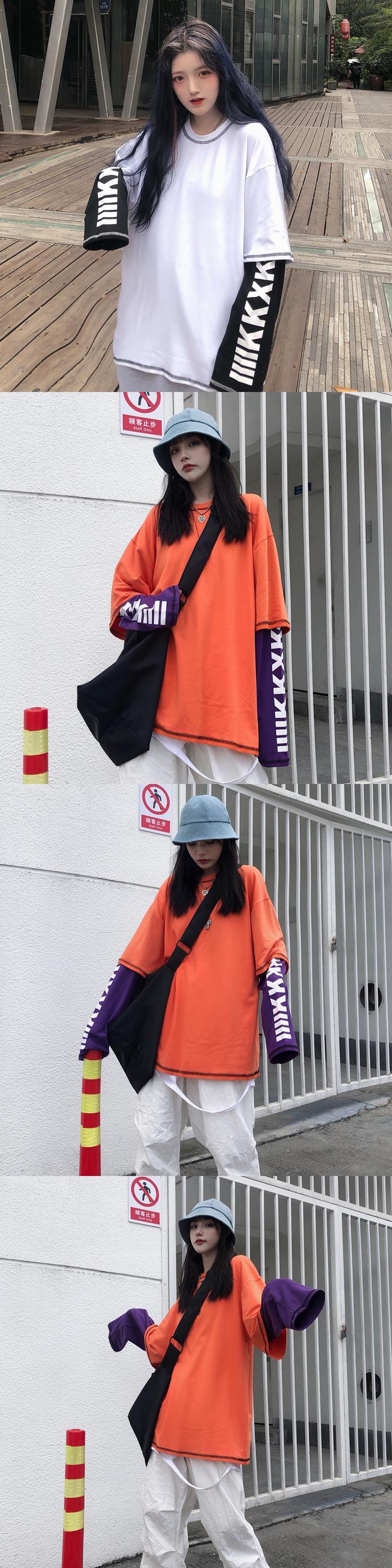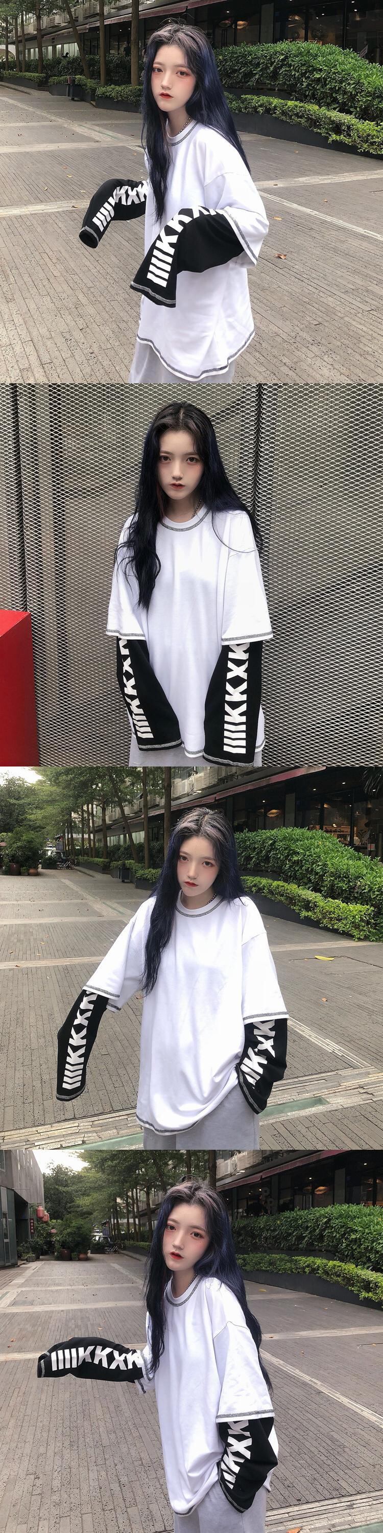 秋物韓国ファッショントレンドスタイルラインプリントツーピースカジュアルルーズTシャツレディース ロング 原宿 オータム ステッチ 長袖 Studios5585824688 | pLegLad Studios