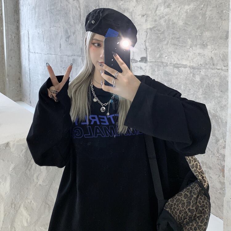 ラウンドネックTシャツレディース秋物韓国ファッショントレンドスタイルプリントルーズトップス ロング 原宿 オータム Oネック 長袖 コーデ モノクロ Studio29285614113 | pLegLad Studios