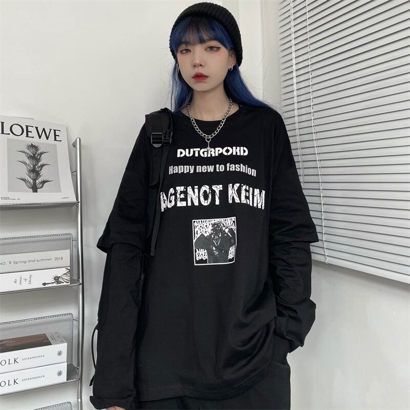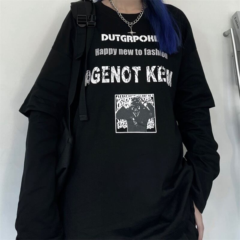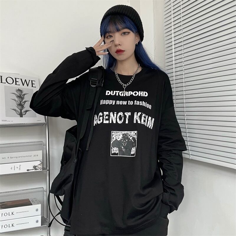 秋物ラウンドネックTシャツシャツ レディース韓国ファッショントレンドプリントルーズゆったりトップス ロング オータム Oネック スタイル 長袖 コーデ モノクロ Studio72989928454 | pLegLad Studios