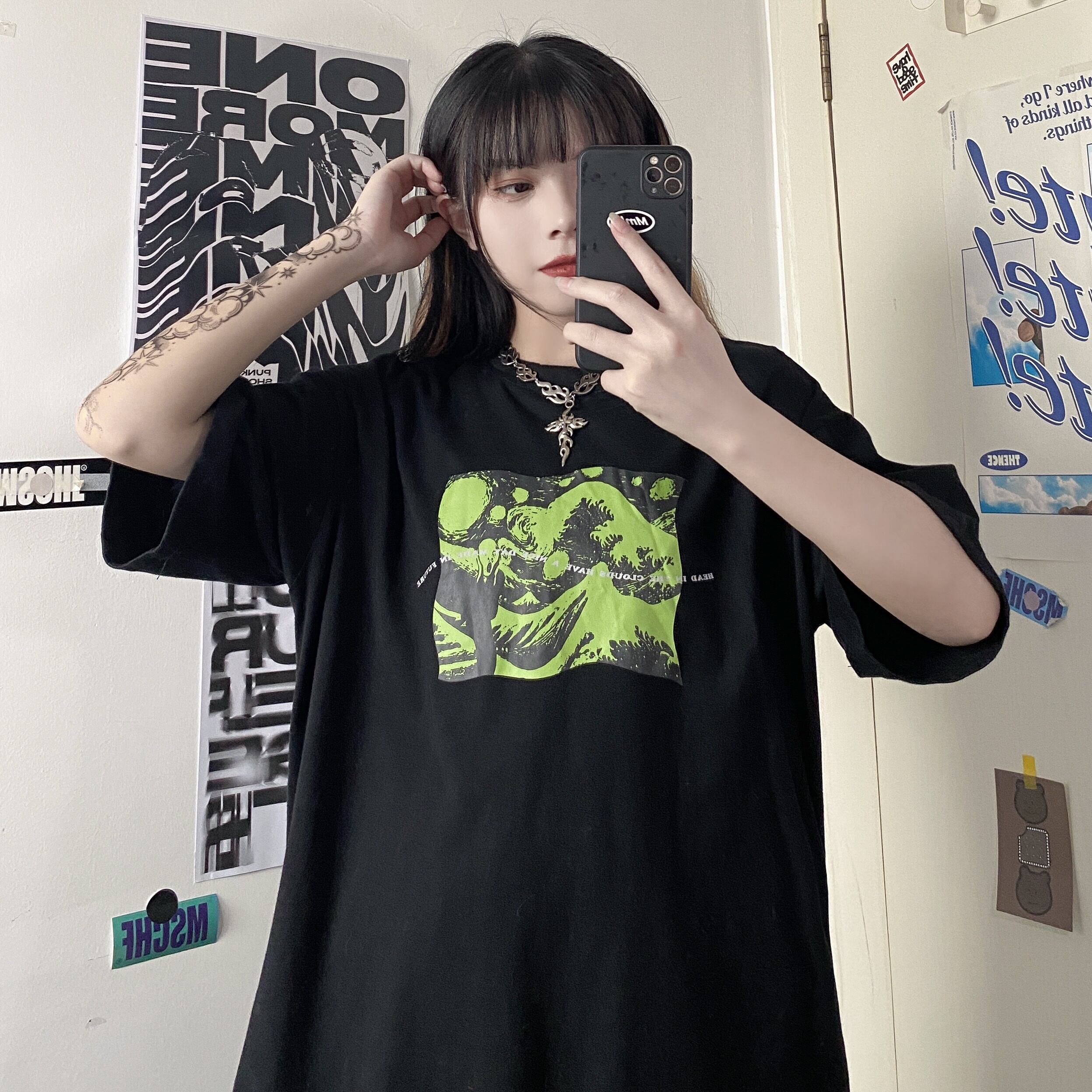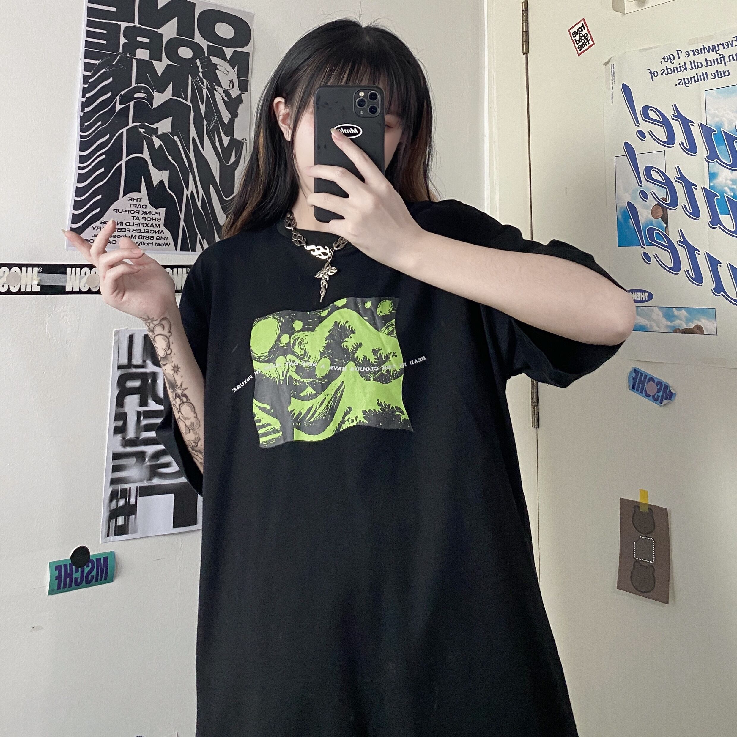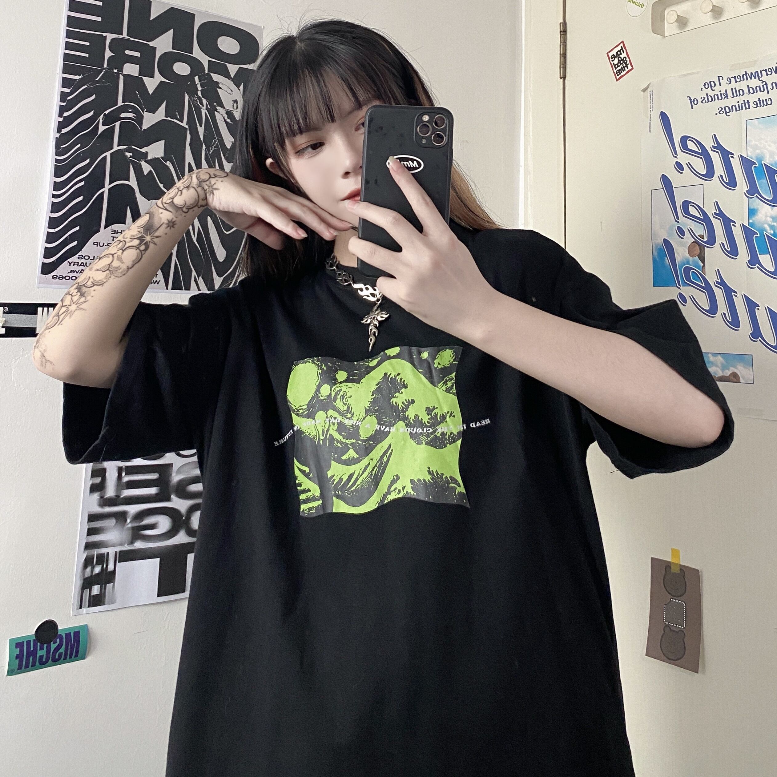 ルーズブラックブラウス レディース夏服韓国ファッショントレンドスタンダードプリントTシャツ レトロ 夏物 ボーイズ スタイル コーデ モノクロ Studio49754187856 | pLegLad Studios