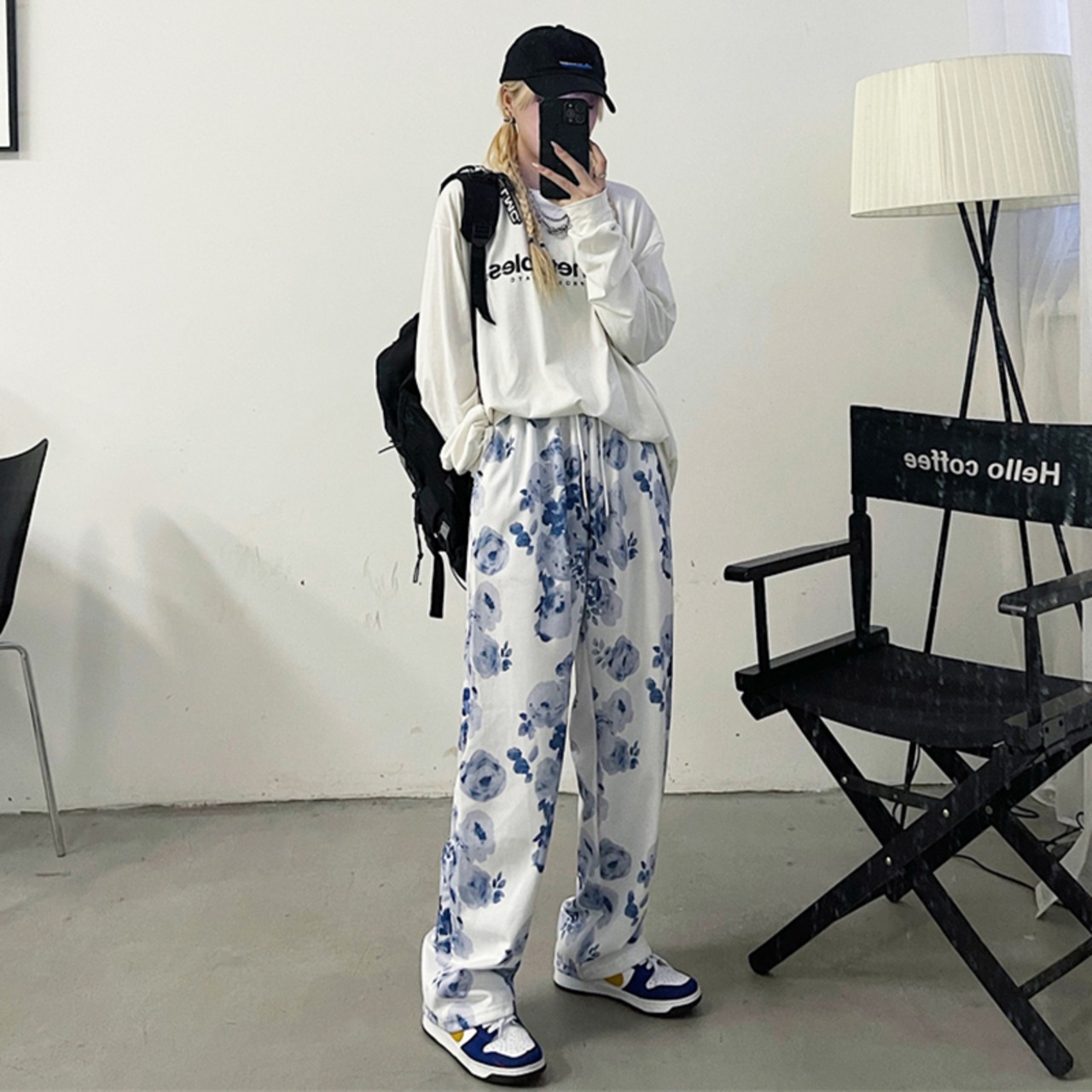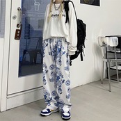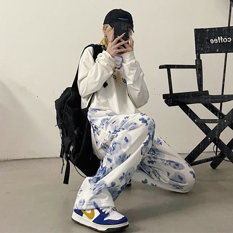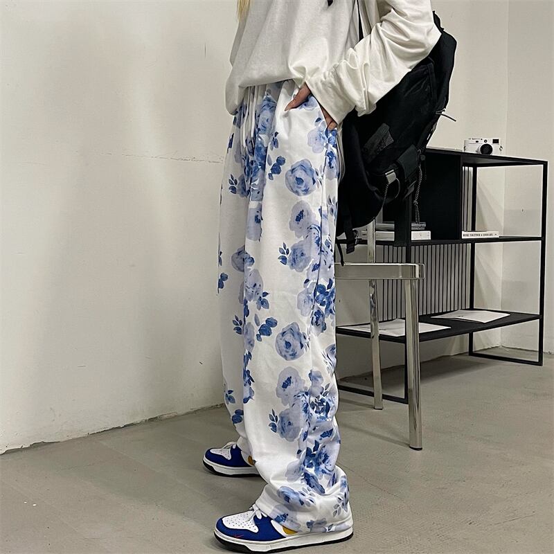 フローラルハイウェストカジュアルパンツ 韓国ファッションスタイル薄手ルーズ秋物 オータム 花柄 ボーイズ ウエスト コーデ モノクロ Studio69585581142 | pLegLad Studios