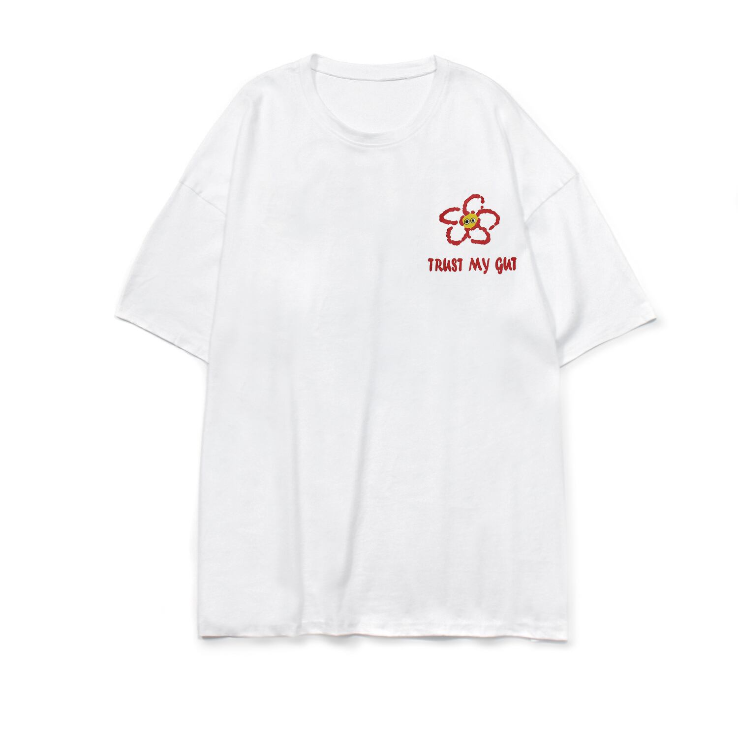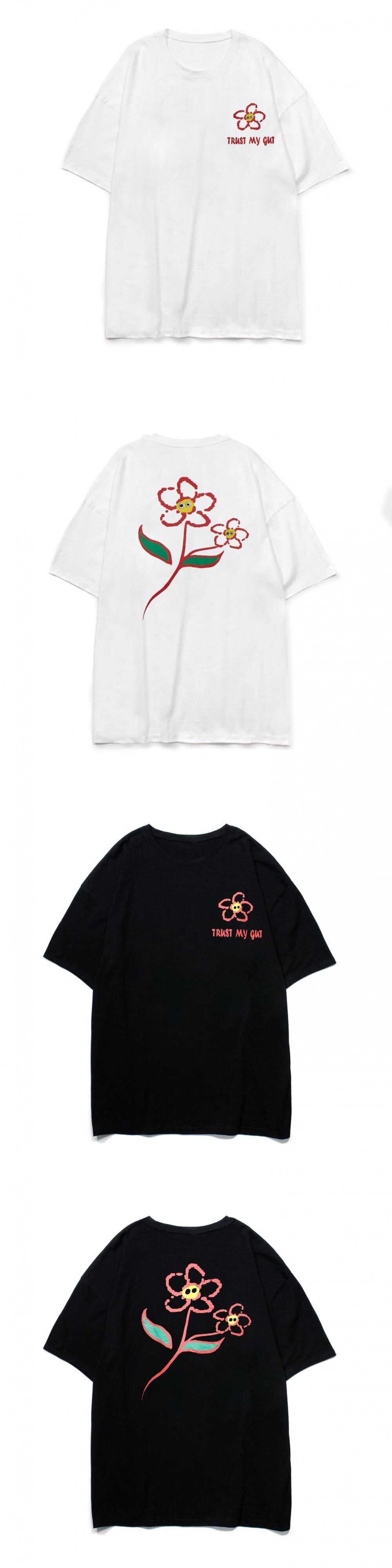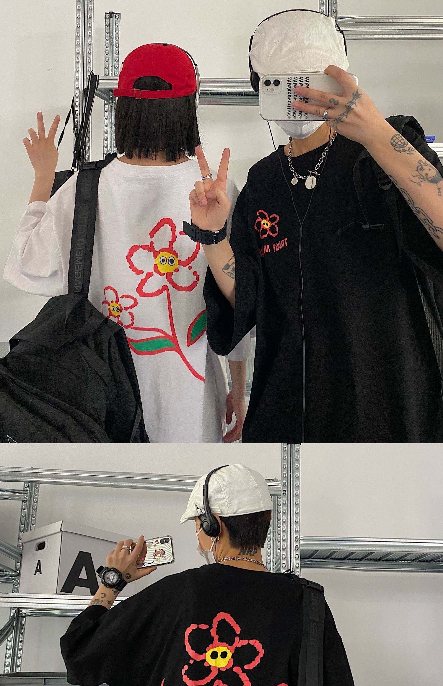 ルーズTシャツシャツ レディース夏服韓国ファッショントレンドFlowerデザイン プリント柄ラウンドネックゆったり 夏物 Oネック フラワーデザイン スタイル コーデ モノクロ Studio95097804668 | pLegLad Studios