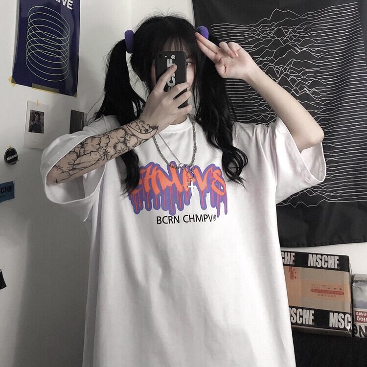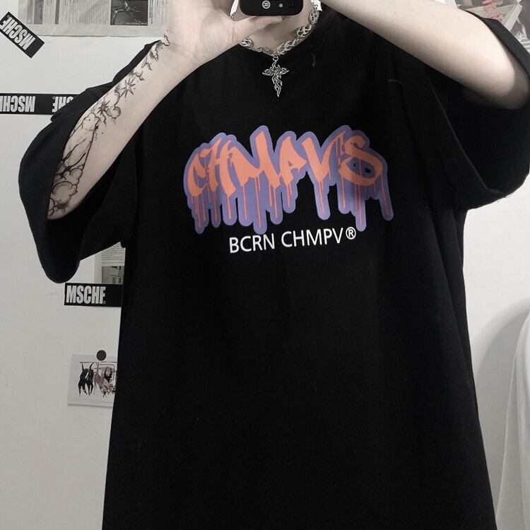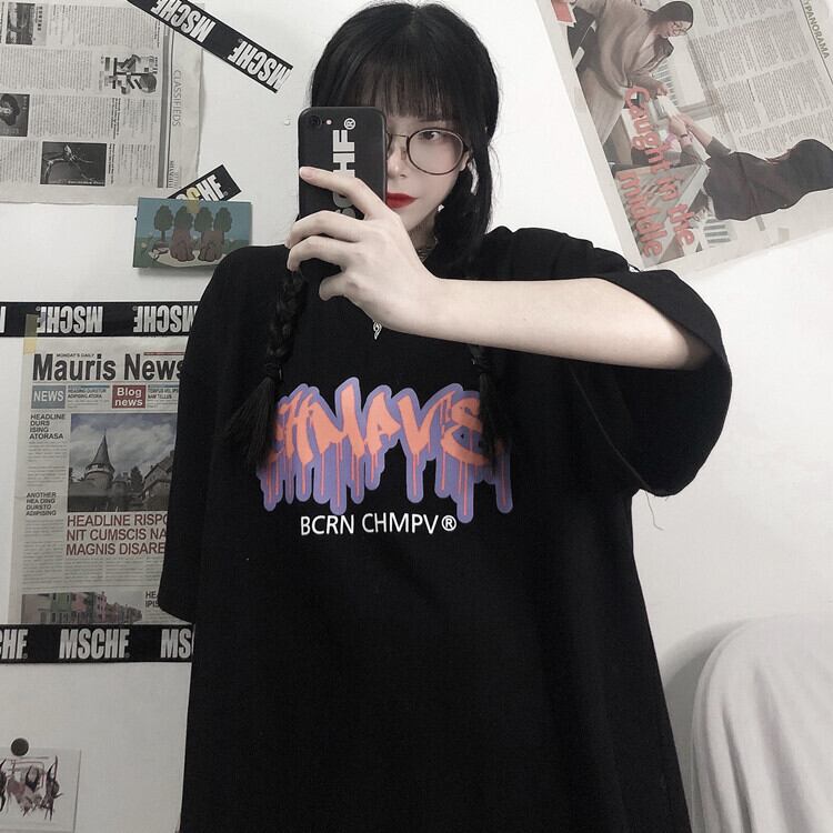 スタイルTシャツレディース夏服ブラックトップス ルーズ韓国ファッションラウンドネックトレンド 原宿 夏物 Oネック コーデ モノクロ Studio66805401048 | pLegLad Studios