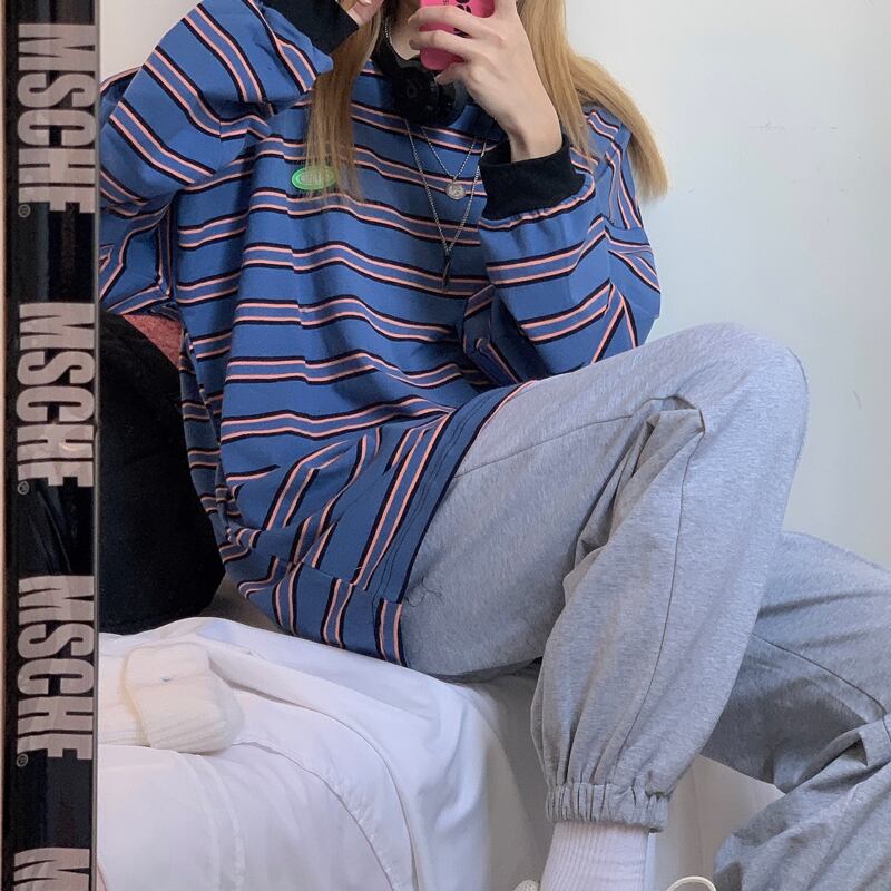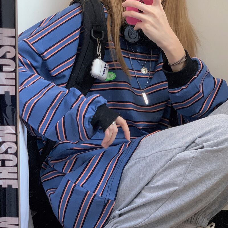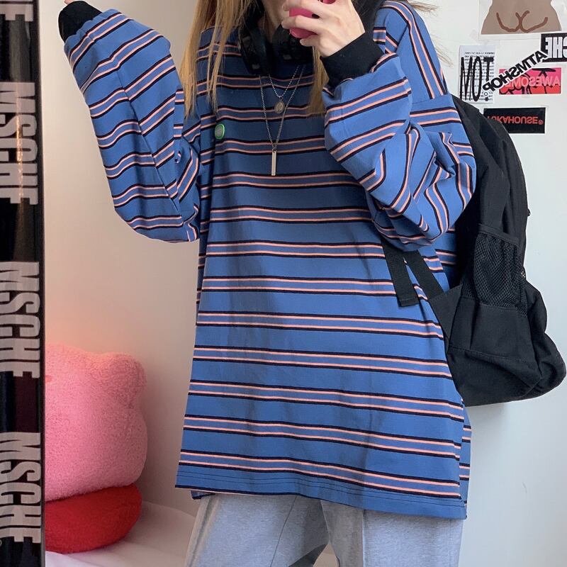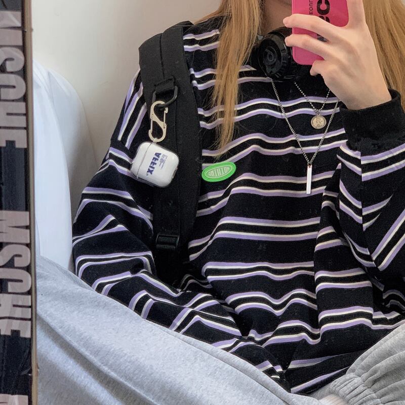 カジュアルTシャツレディース秋物韓国ファッショントレンドスタイルストライプトップス ロング オータム ボーイズ 長袖 コーデ モノクロ Studio45091002128 | pLegLad Studios
