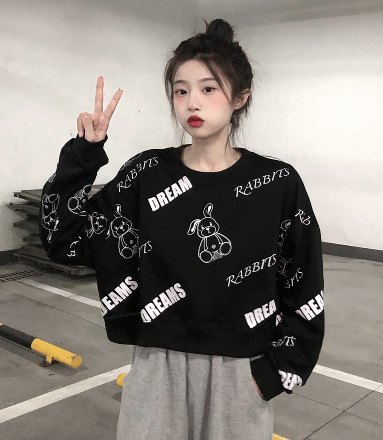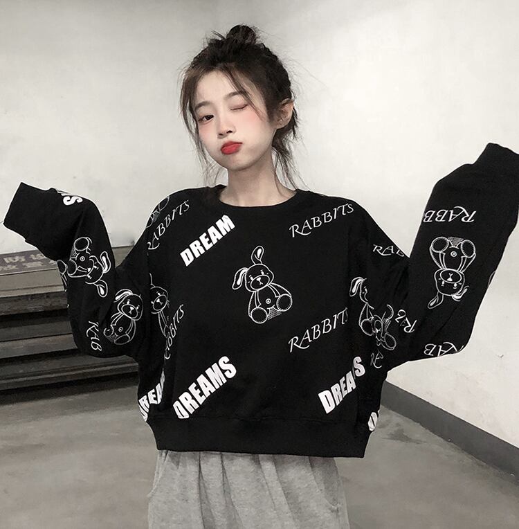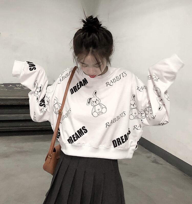 色:白い全身うさぎの短いセーター,ブラックオールオーバーラビットショートスウェットシャツ