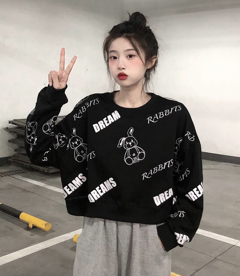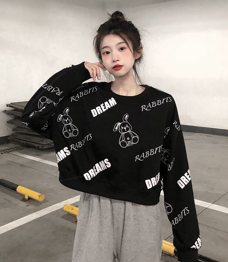 ブラックショートセーター レディース秋物韓国ファッショントレンドプリント柄ルーズトップス コート ロング オータム スタイル 長袖 コーデ モノクロ Studio37529228601 | pLegLad Studios
