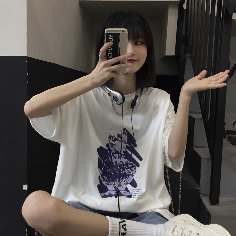 Tシャツレディース夏服韓国ファッショントレンドスタンダードパターンプリントルーズトップス レトロ 夏物 スタイル コーデ モノクロ Studio56339067746 | pLegLad Studios