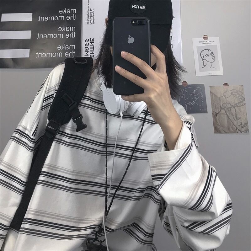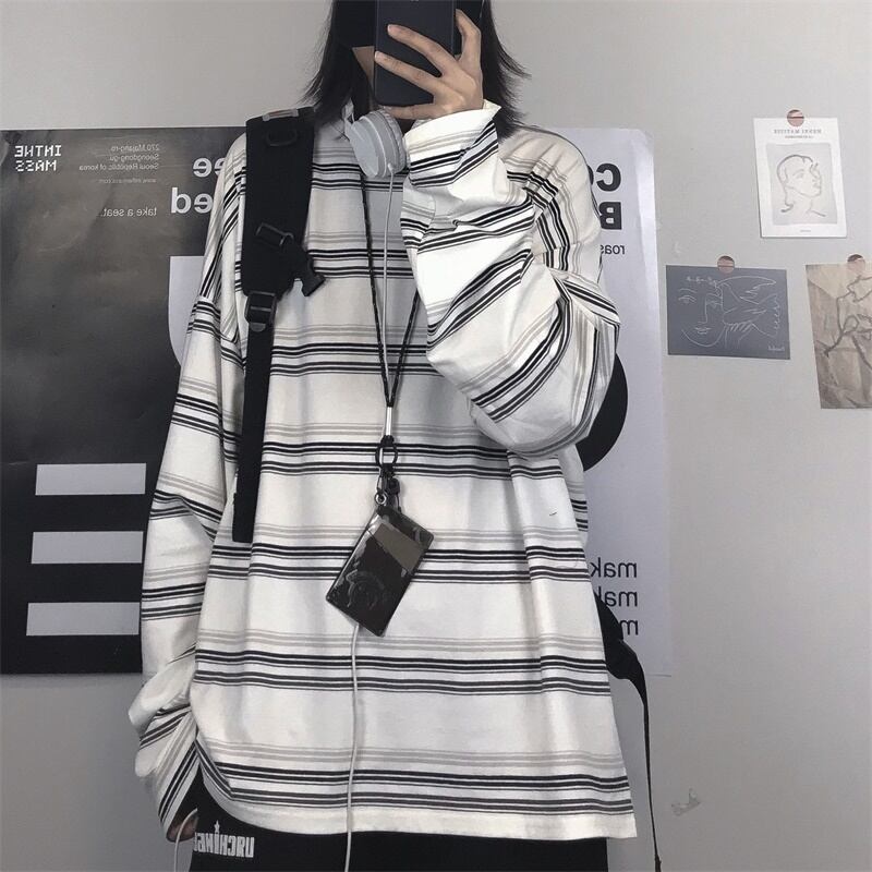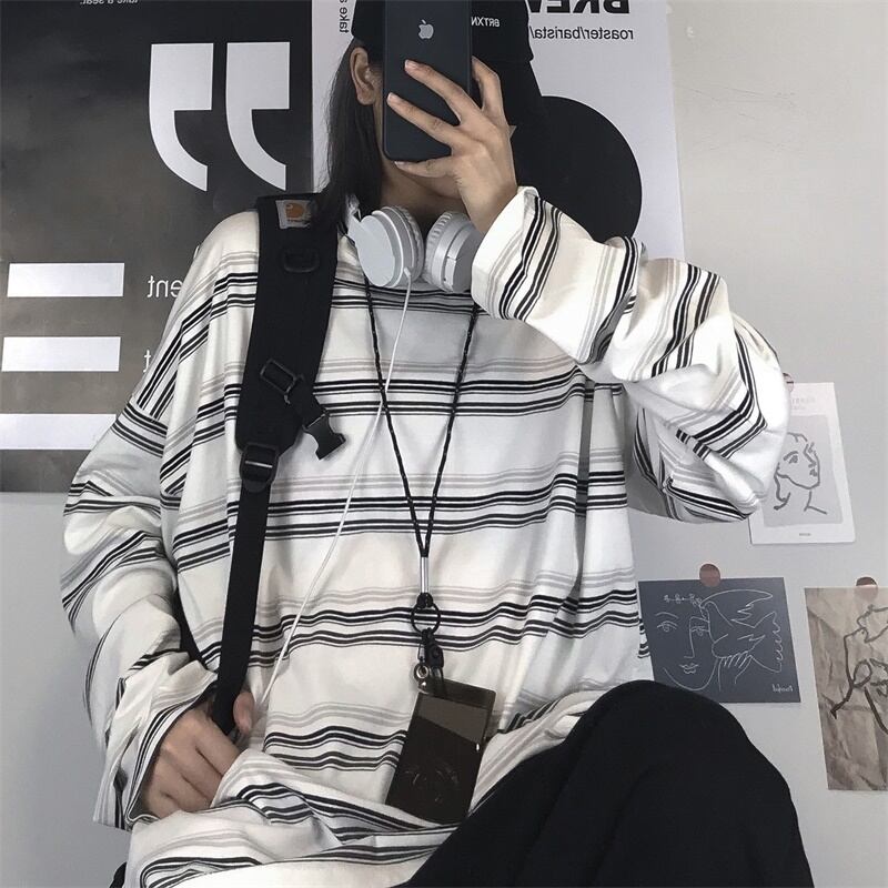 秋物韓国ファッションNEWストライプゆったりシャツ トップス カジュアルルーズTシャツレディース ロング オータム スタイル 長袖 Studios436576506 | pLegLad Studios