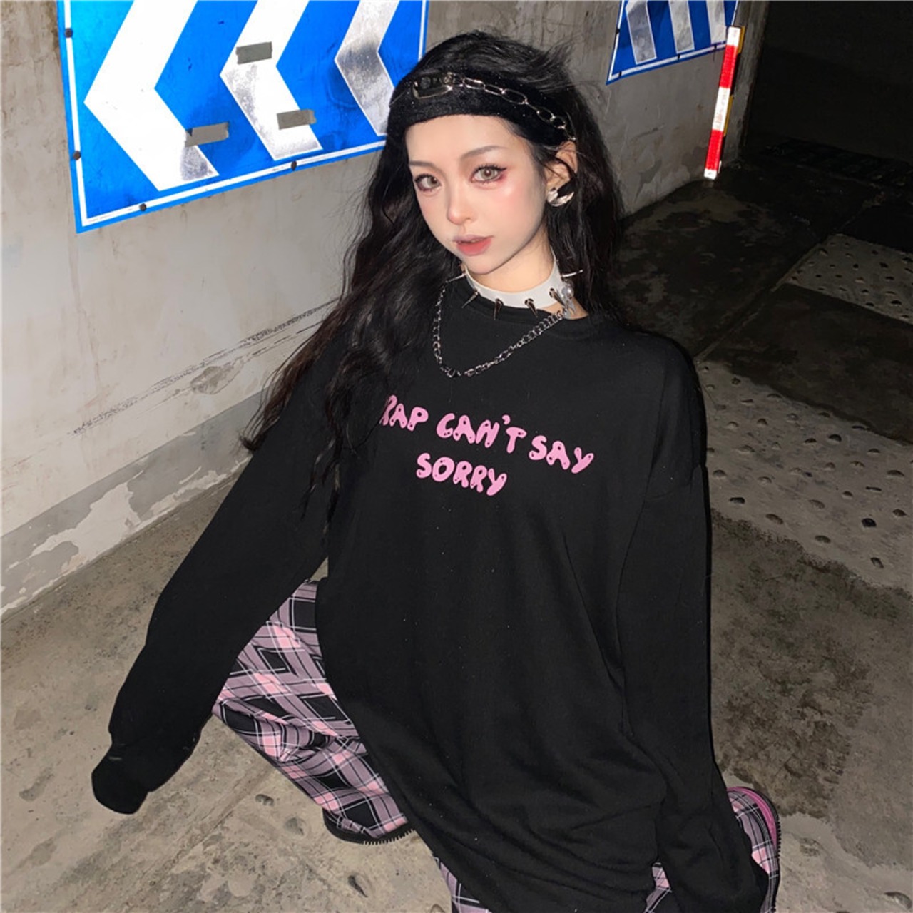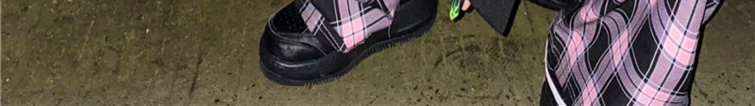 色:黒,パープルチェックパンツ