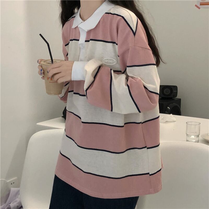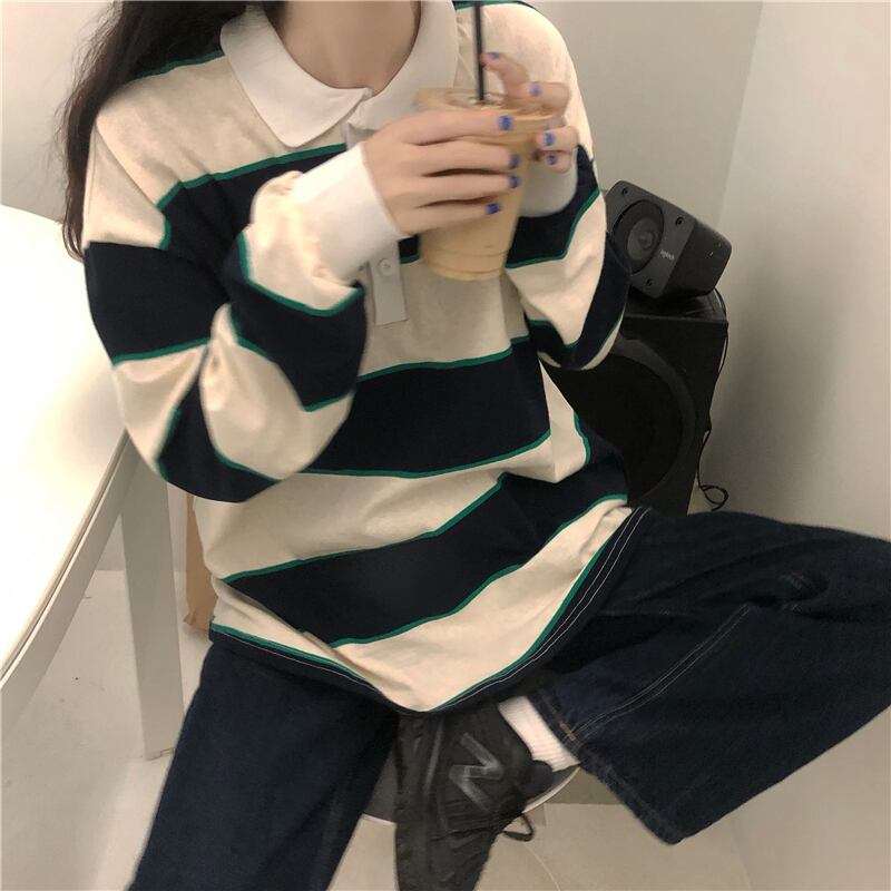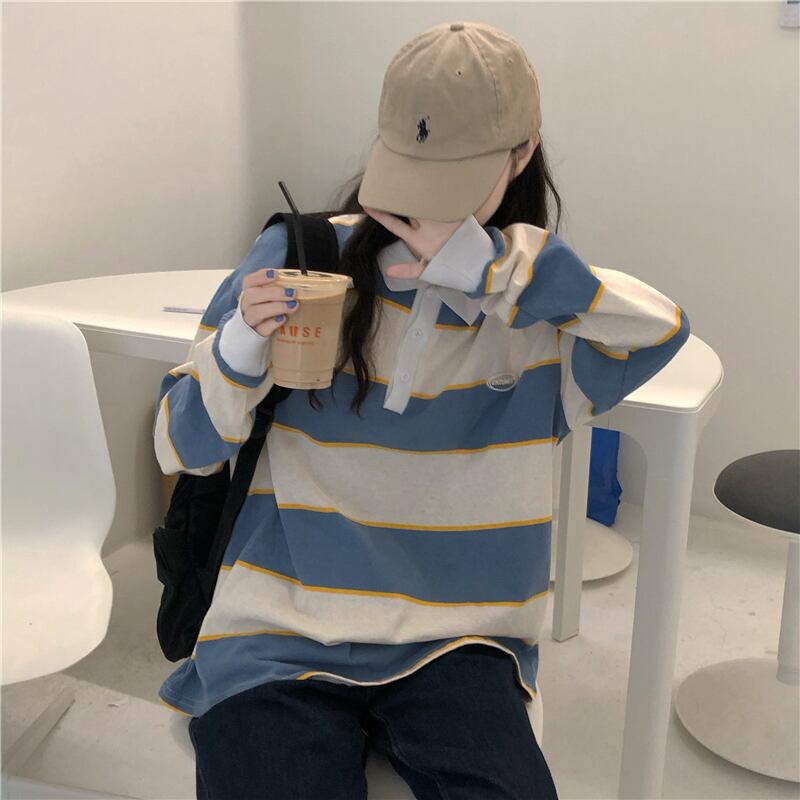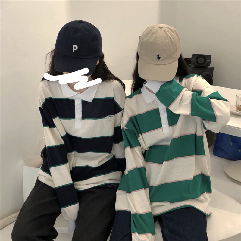 夏服韓国ファッションNEWスタンダードカラーストライプカジュアルルーズTシャツレディース ロング レトロ 夏物 スタイル 長袖 Studios54492808622 | pLegLad Studios