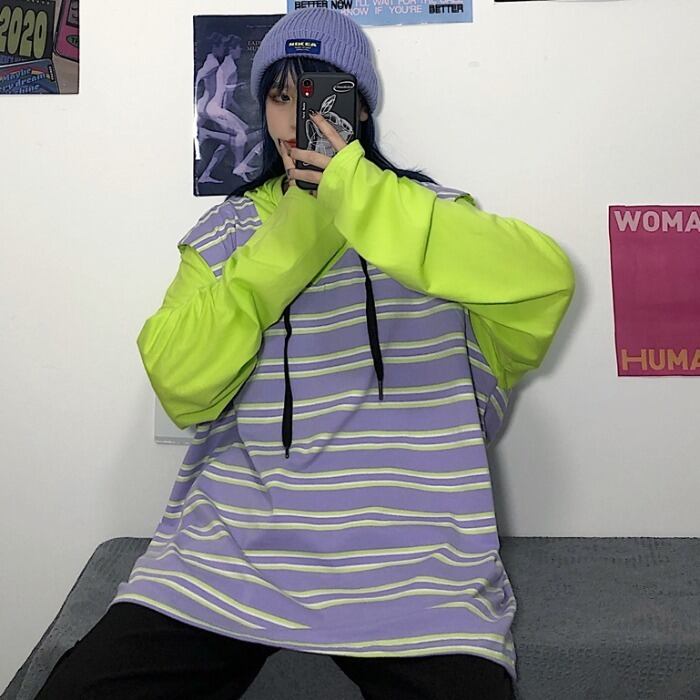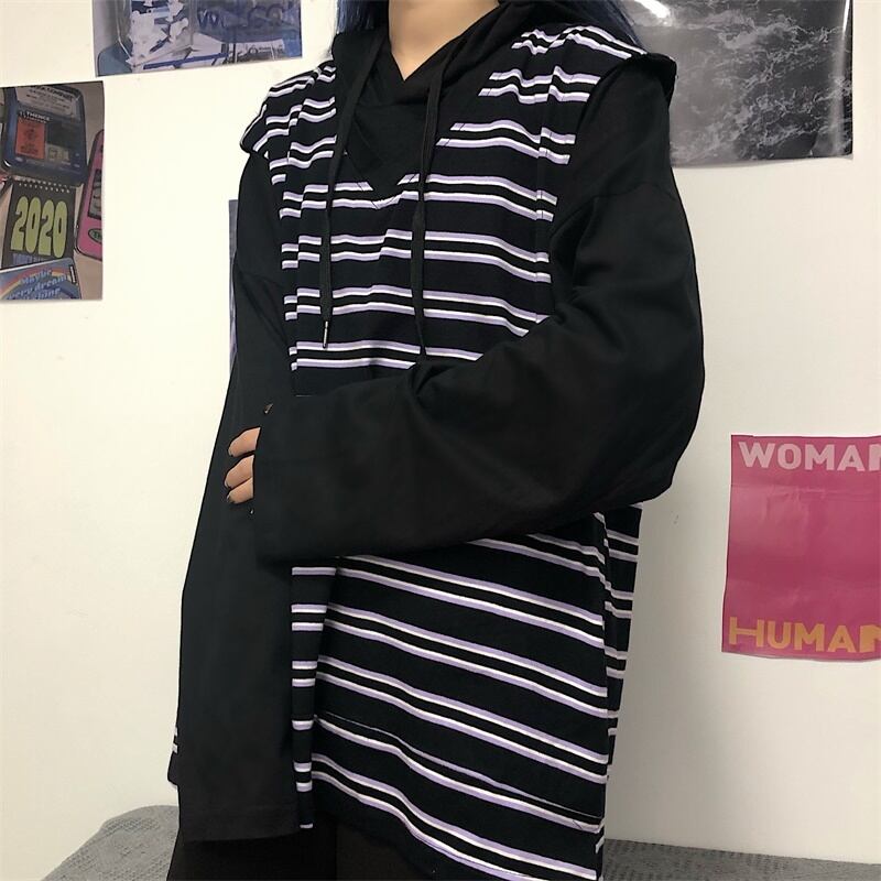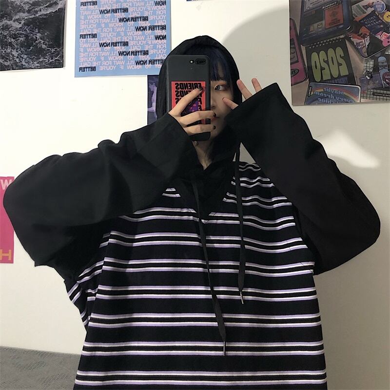 秋物韓国ファッションNEWストライプツーピースカジュアルルーズフードセーター メンズレディース ロング オータム ステッチ スタイル 長袖 Studios81731096477 | pLegLad Studios