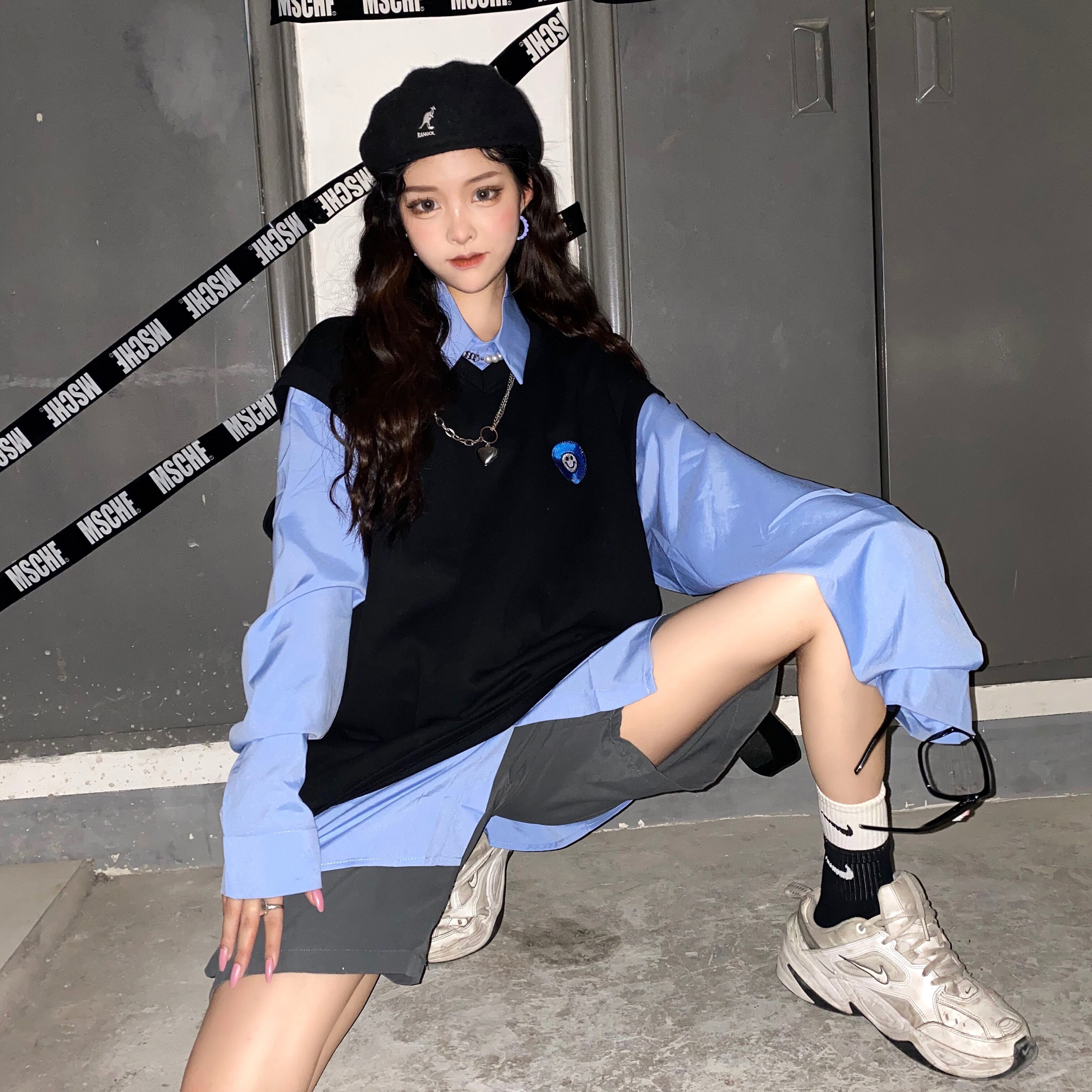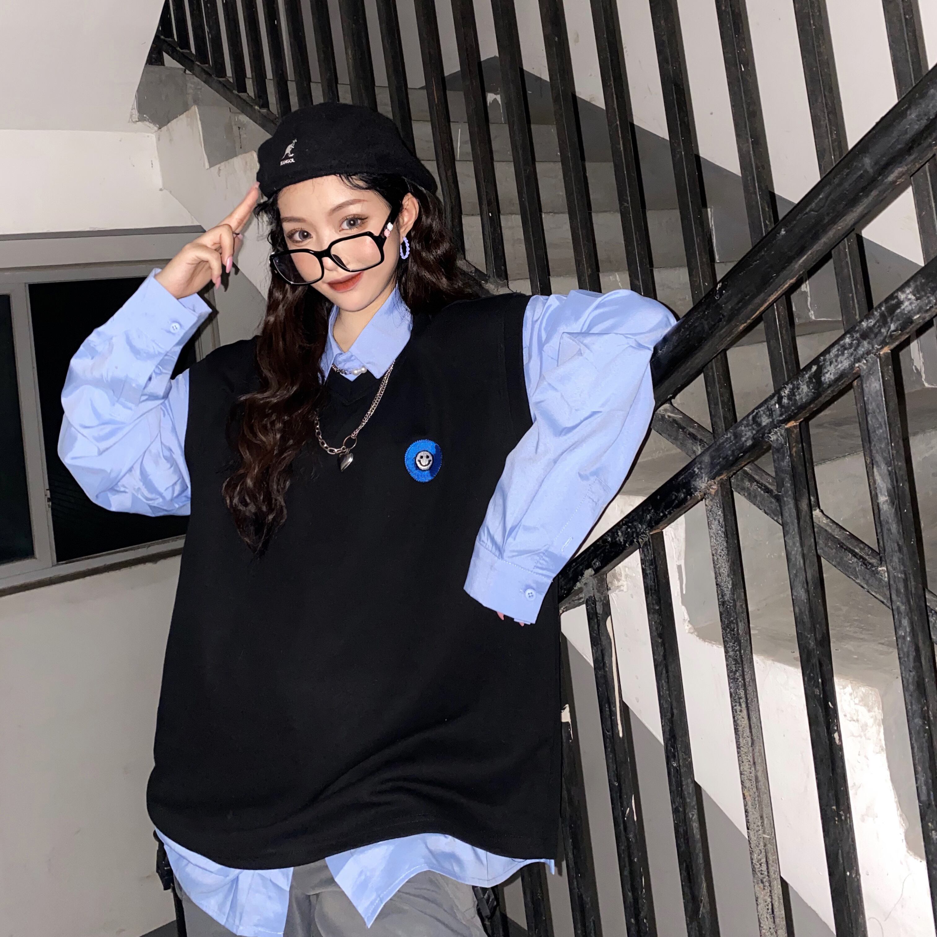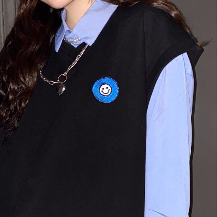 色:青いシャツ,黒のベスト