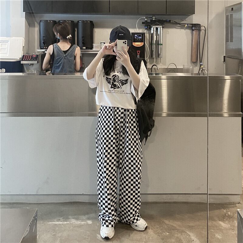 ブラックホワイト格子柄パンツ レディース夏服韓国ファッションNEW薄手ルーズハイウェストウェストカジュアル 夏物 スタイル ウエスト Studios70651146600 | pLegLad Studios