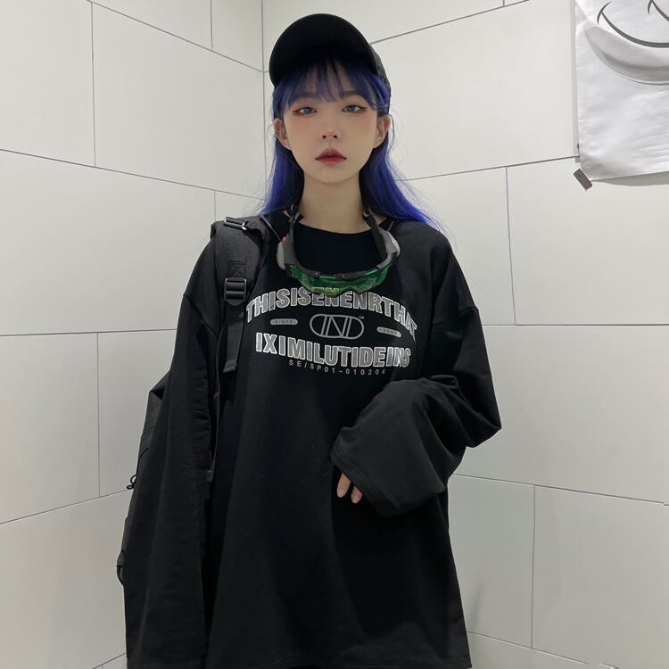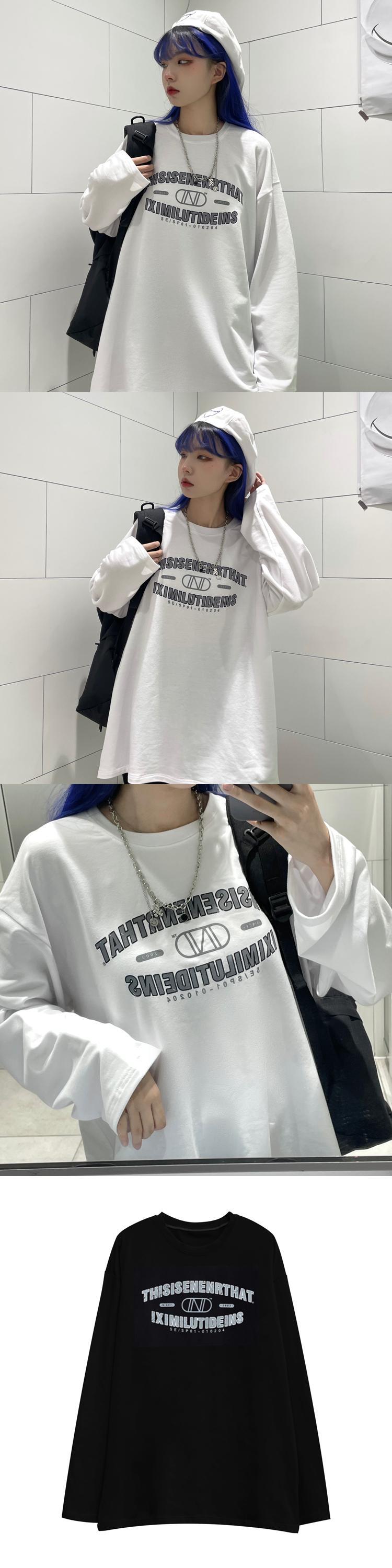 ホワイトゆったりシャツ レディース秋物韓国ファッションスタンダードプリントルーズTシャツ ロング レトロ オータム スタイル 長袖 コーデ モノクロ Studio44804679356 | pLegLad Studios