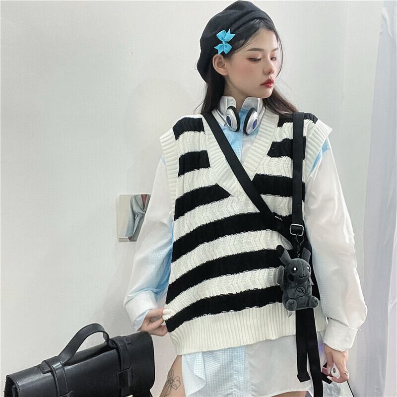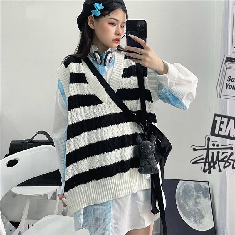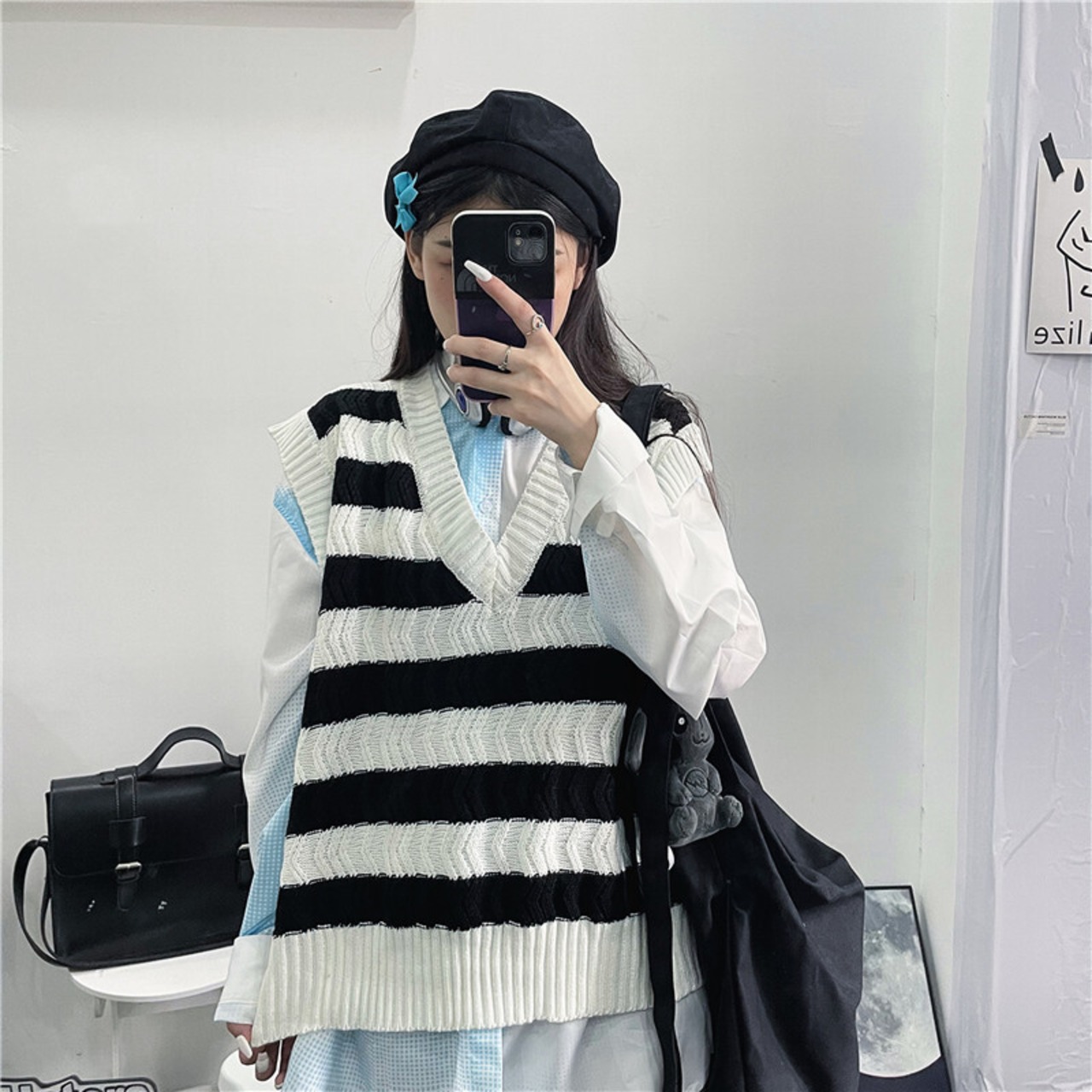 ストライプニット秋物韓国ファッションVネックプルオーバー ルーズセーター オータム ステッチ スタイル ウエスト コーデ モノクロ Studio2543669740 | pLegLad Studios
