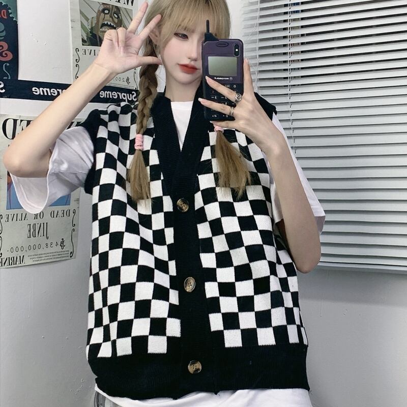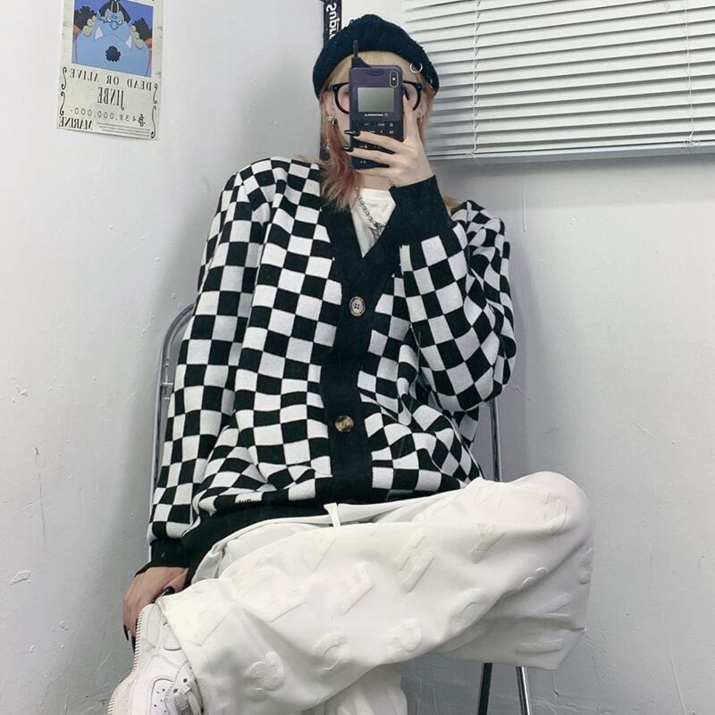 スタイルニットカーディガンジャケット レディース秋物韓国ファッションVネックルーズノースリーブトップス ロング オータム 長袖 コーデ モノクロ Studio58132711061 | pLegLad Studios