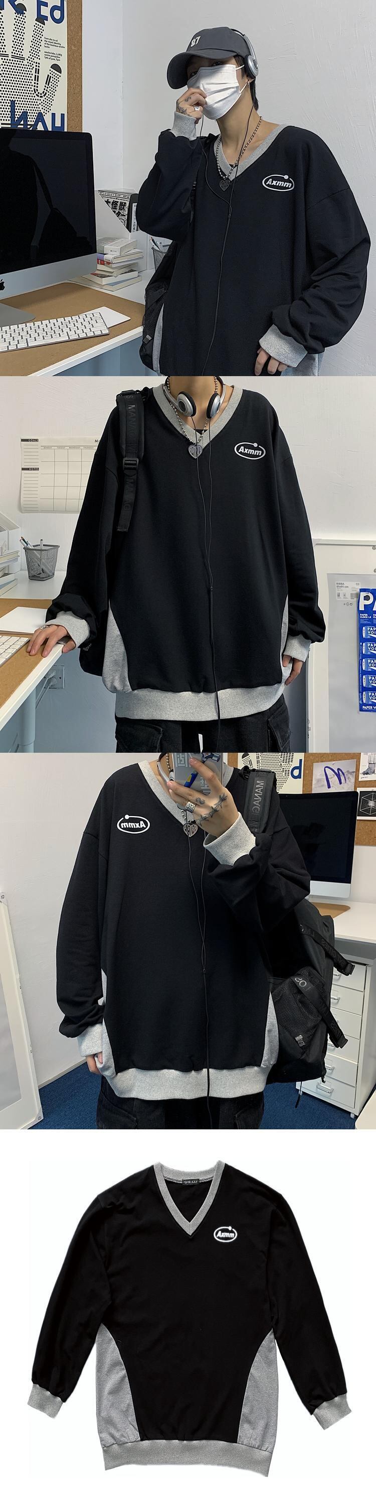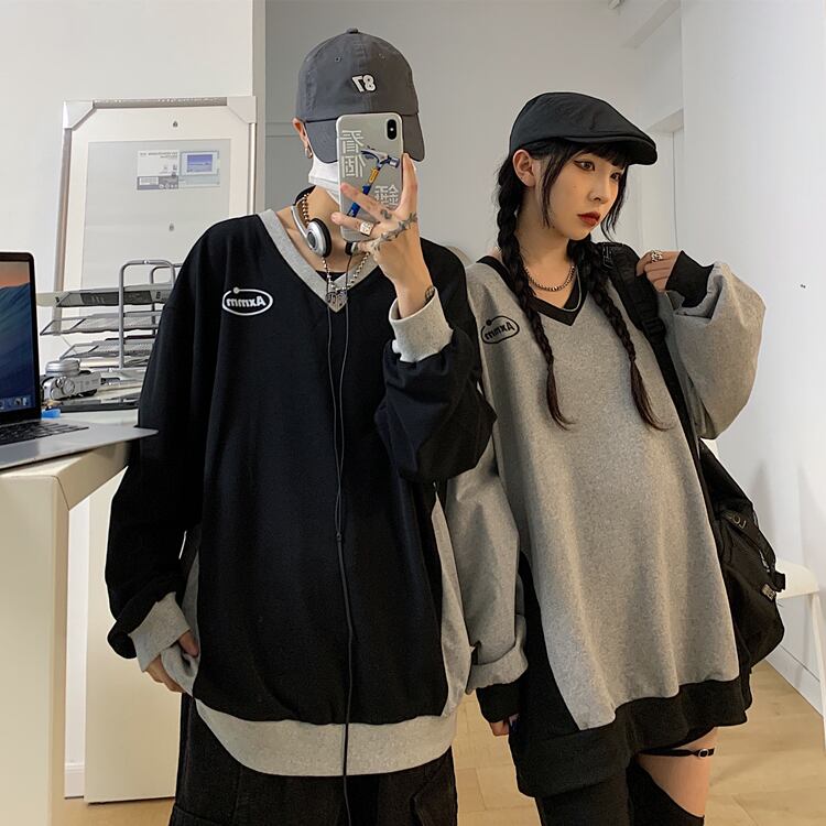スタイルカラーカジュアルTシャツレディース秋物韓国ファッションNEWルーズVネックトップス ロング 原宿 オータム ボーイズ 長袖 コーデ モノクロ Studio30774132430 | pLegLad Studios