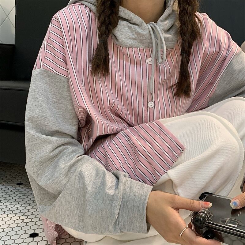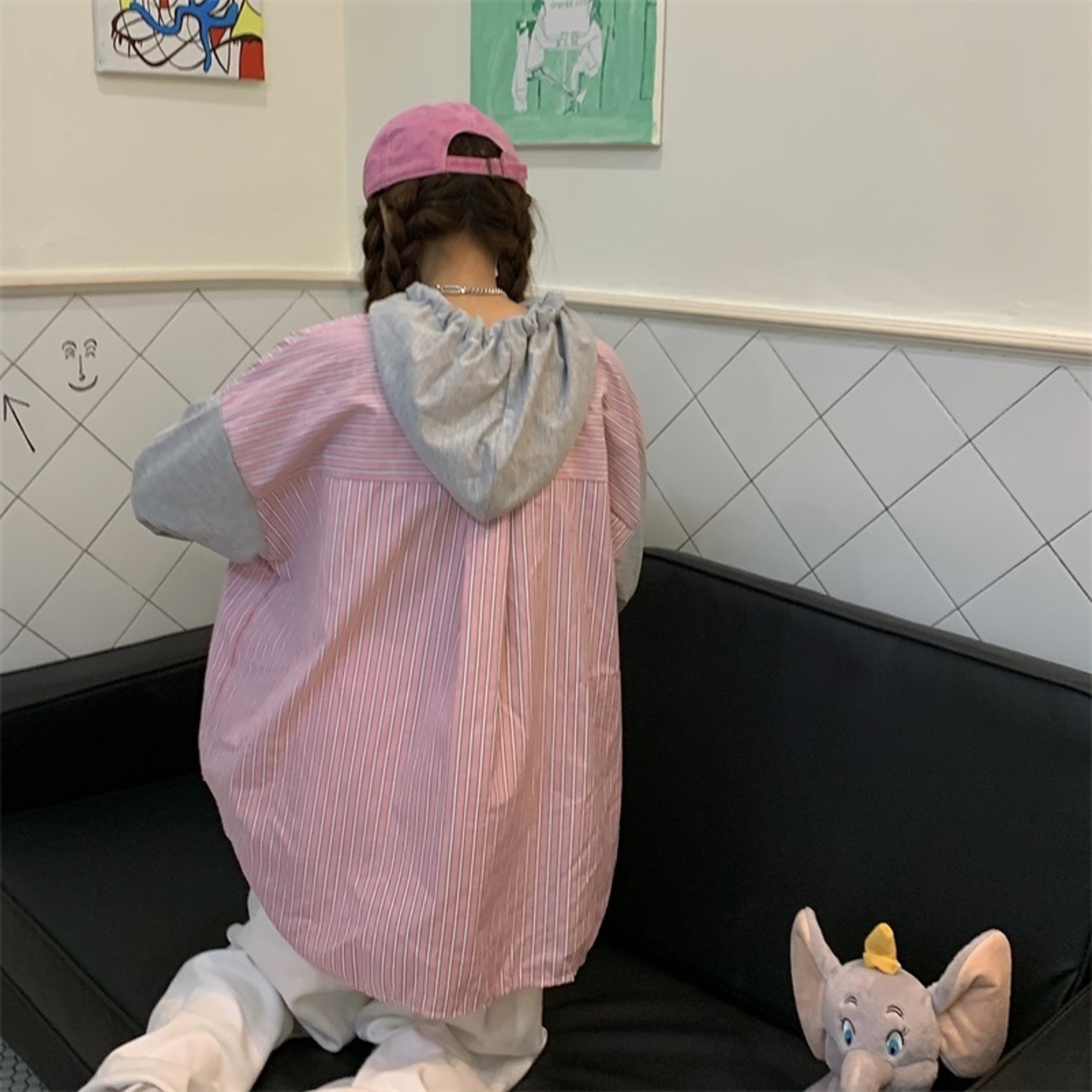 秋物韓国ファッションNEWスタンダードストライプカジュアルルーズフードシャツ レディース ロング ピンク レトロ オータム ステッチ スタイル 長袖 Studios37258829201 | pLegLad Studios