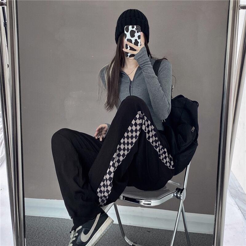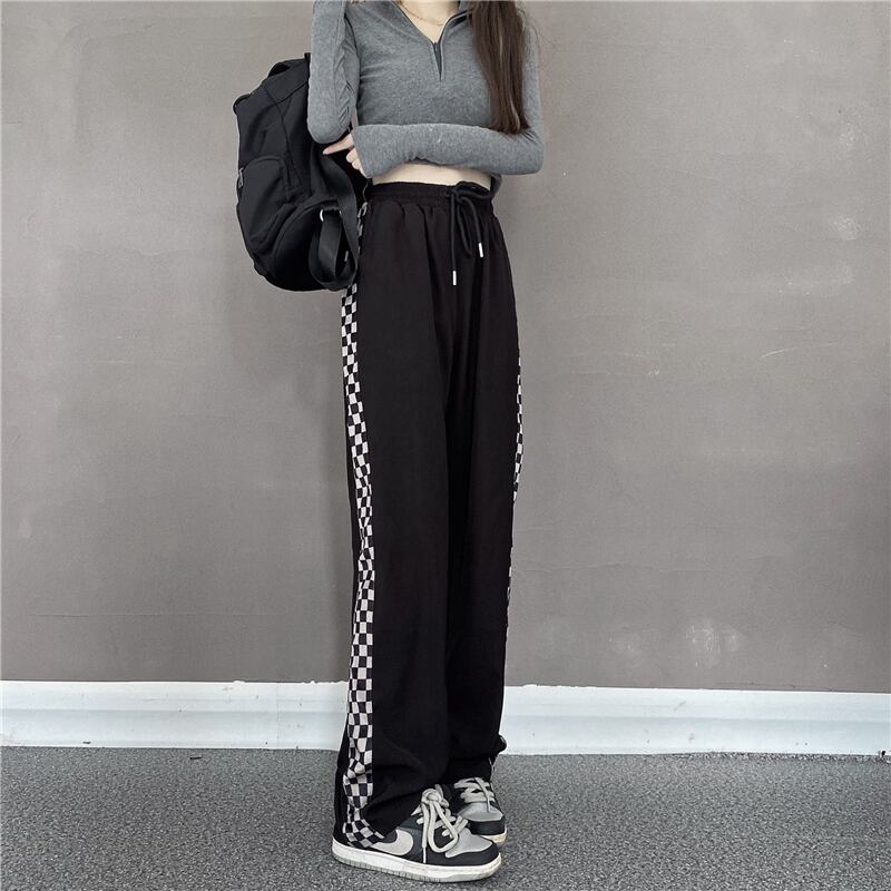 格子柄カジュアルパンツ 秋物韓国ファッションNEWルーズハイウェストウェストワイドレッグ オータム ワイドパンツ ステッチ スタイル ウエスト コーデ モノクロ Studio60161189028 | pLegLad Studios
