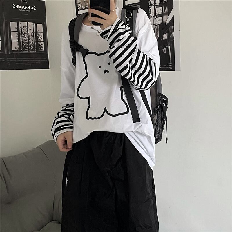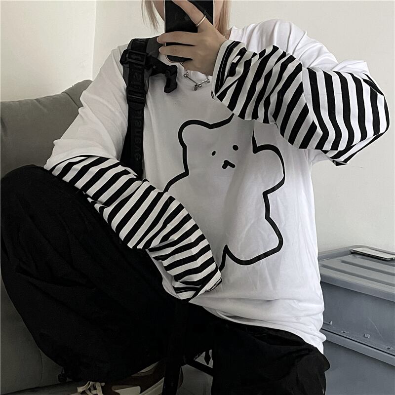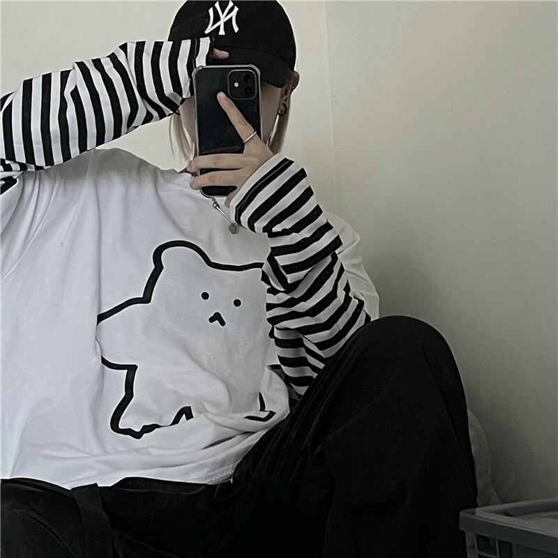 ストライプカラーTシャツシャツ 秋物韓国ファッションNEWプリント柄ゆったり ロング オータム スタイル 長袖 コーデ モノクロ Studio13903921176 | pLegLad Studios
