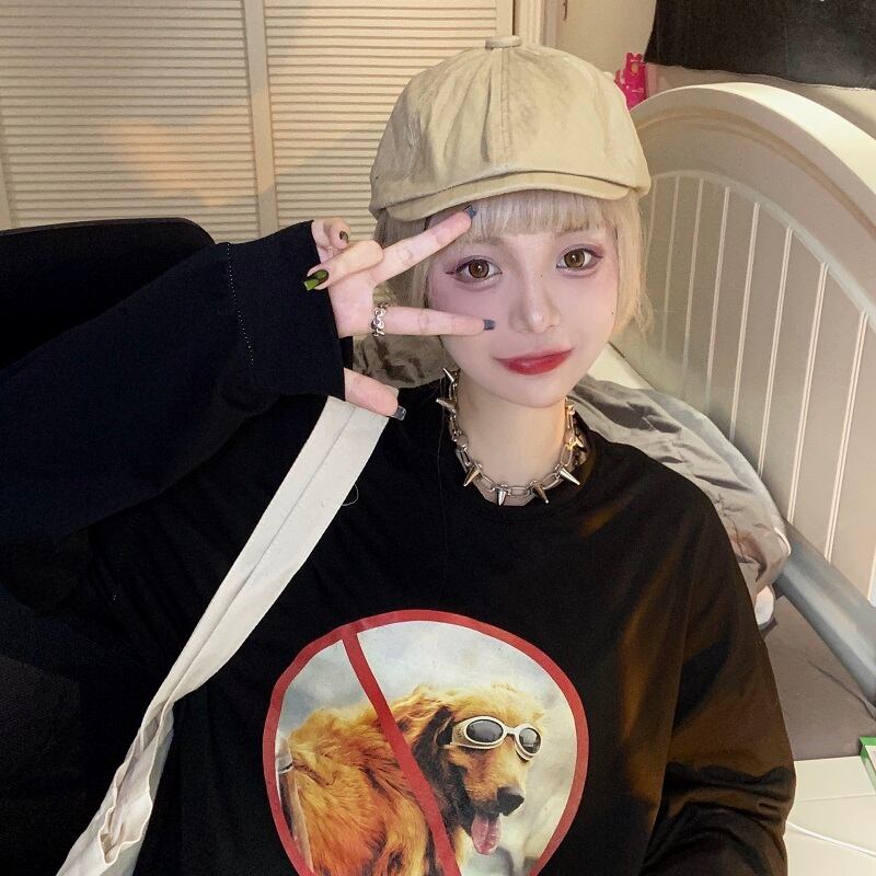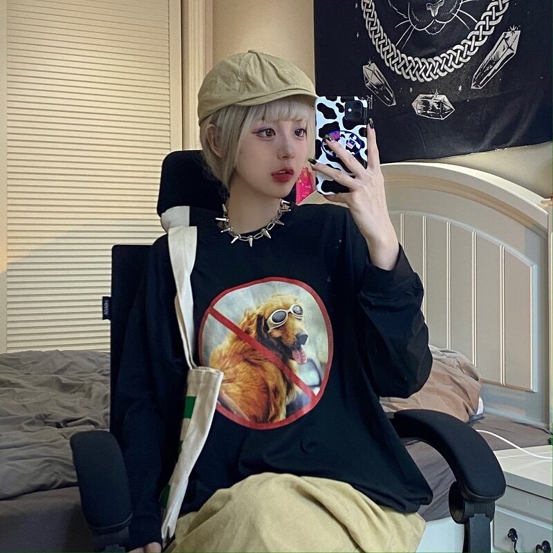 ルーズTシャツシャツ レディース秋物韓国ファッションプリント柄ラウンドネックゆったり ロング オータム Oネック スタイル 長袖 コーデ モノクロ Studio76336806475 | pLegLad Studios