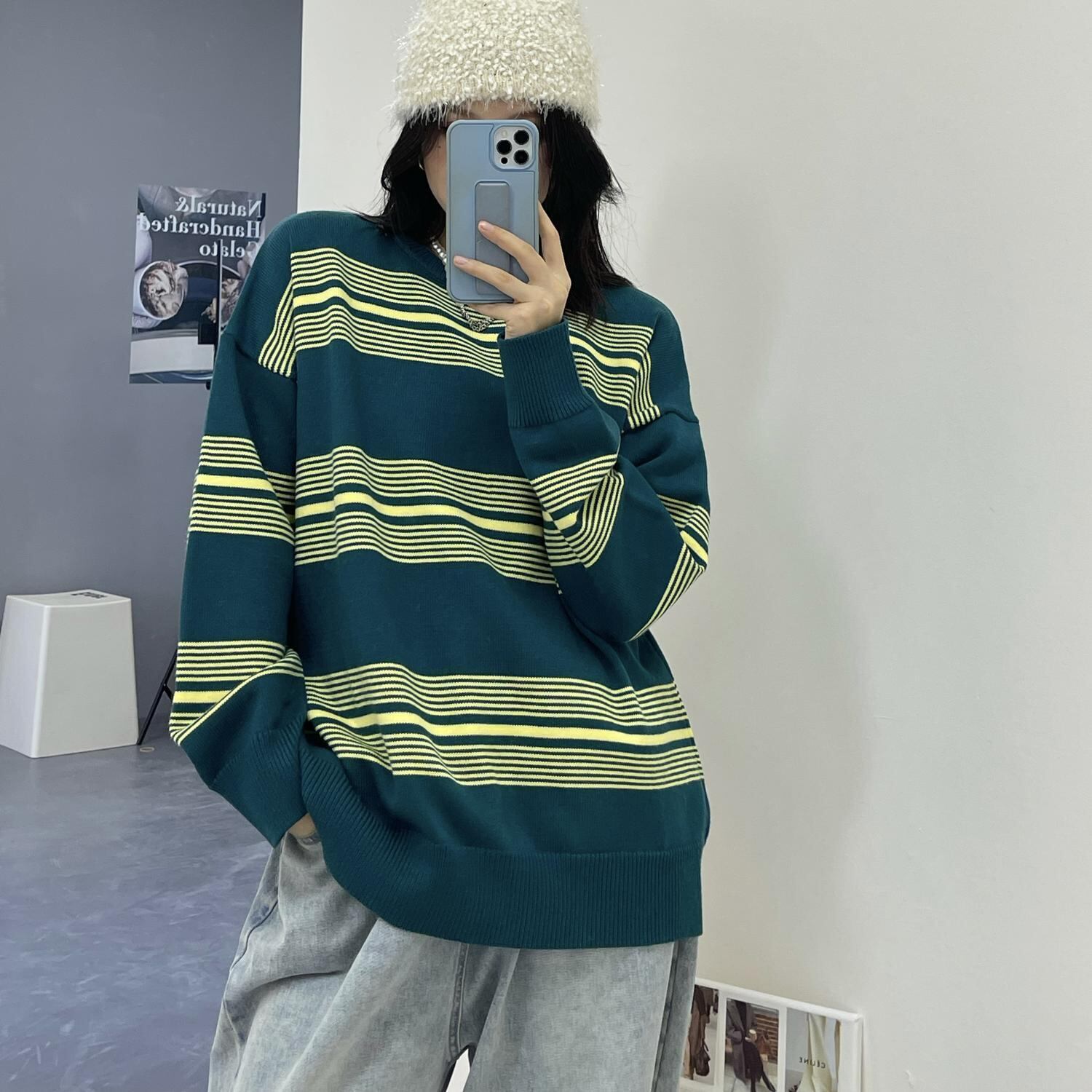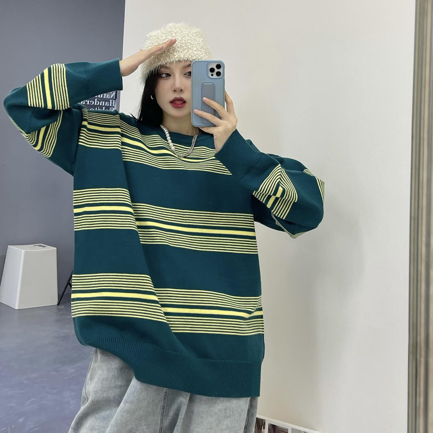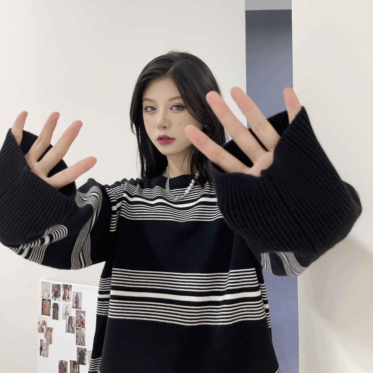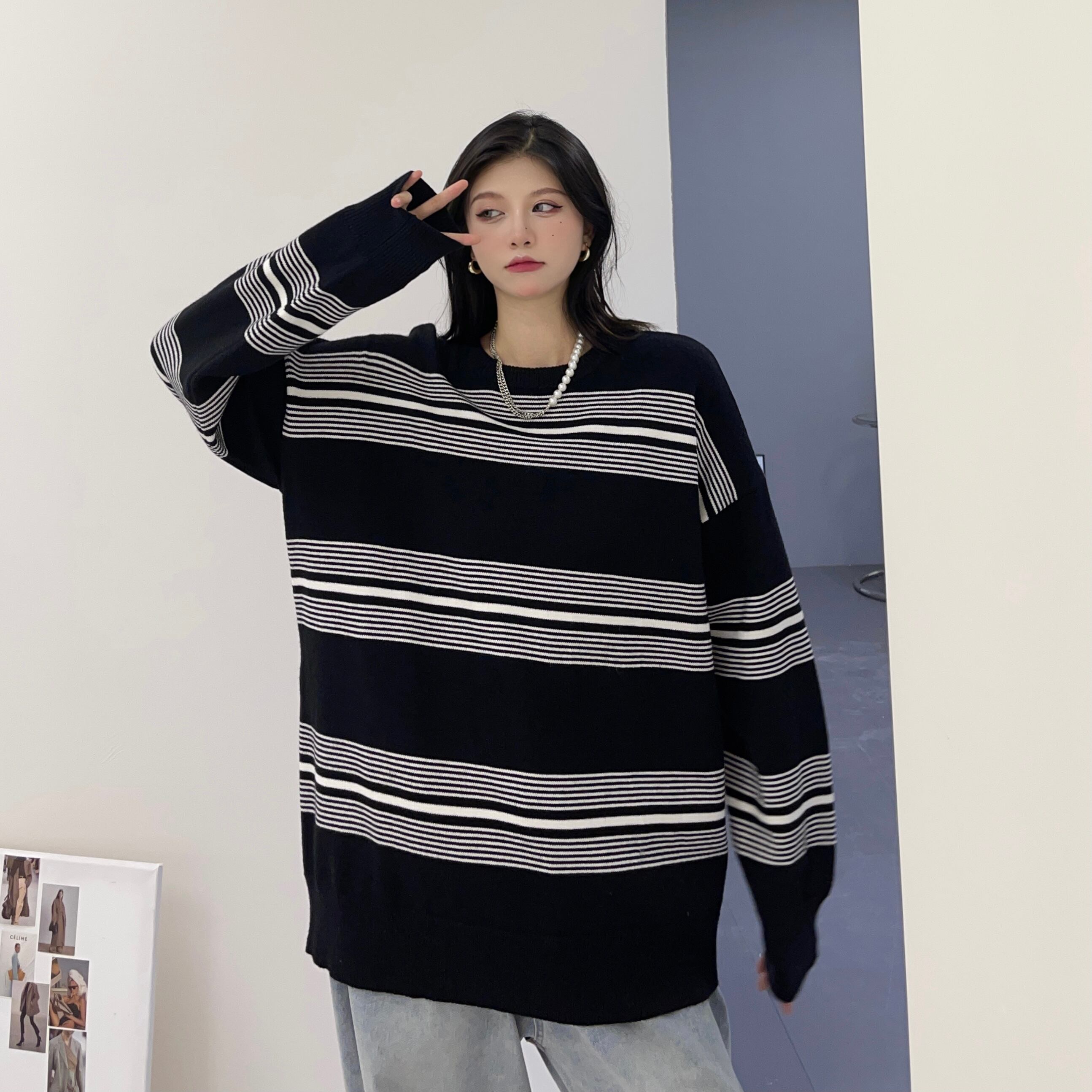 秋物韓国ファッションNEWスタイルラウンドネックストライプカラールーズセーター レディース ロング 原宿 オータム Oネック 長袖 コーデ モノクロ Studio48406957483 | pLegLad Studios
