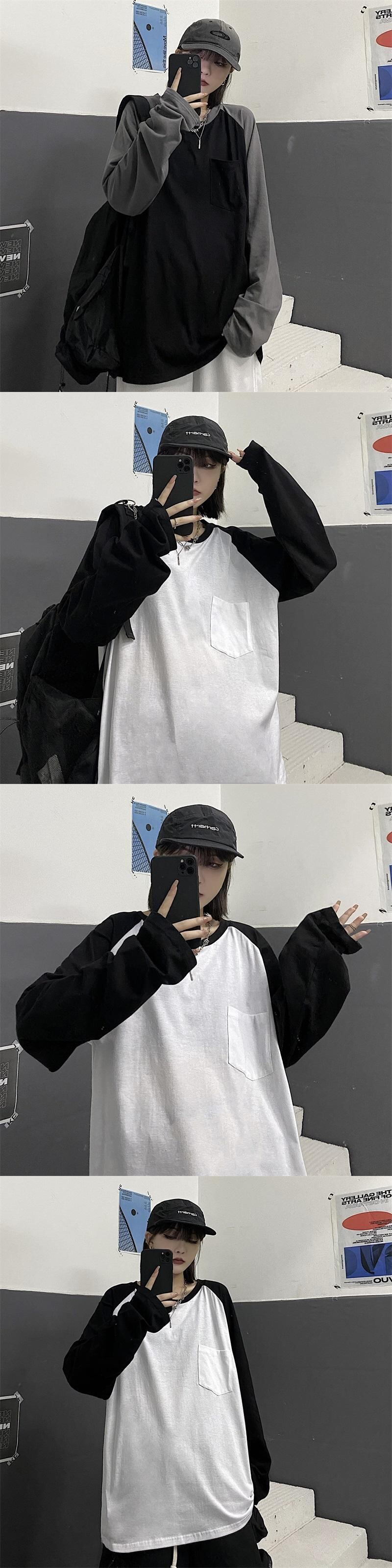 秋物韓国ファッションNEWカラースリーブゆったりシャツ ルーズラウンドネックTシャツトップス メンズレディース ロング ストリート オータム Oネック スタイル 長袖 Studios76581937705 | pLegLad Studios