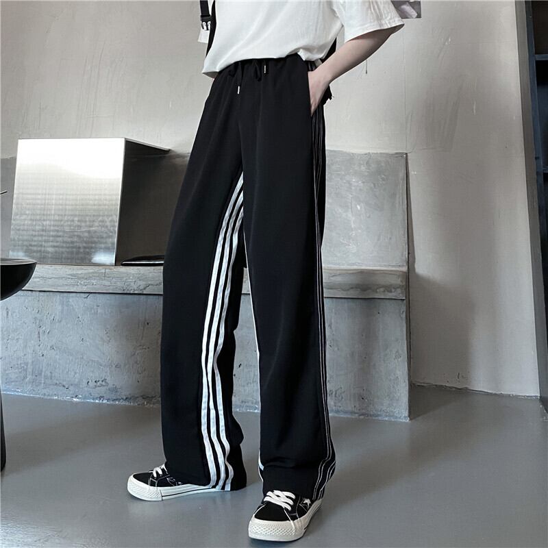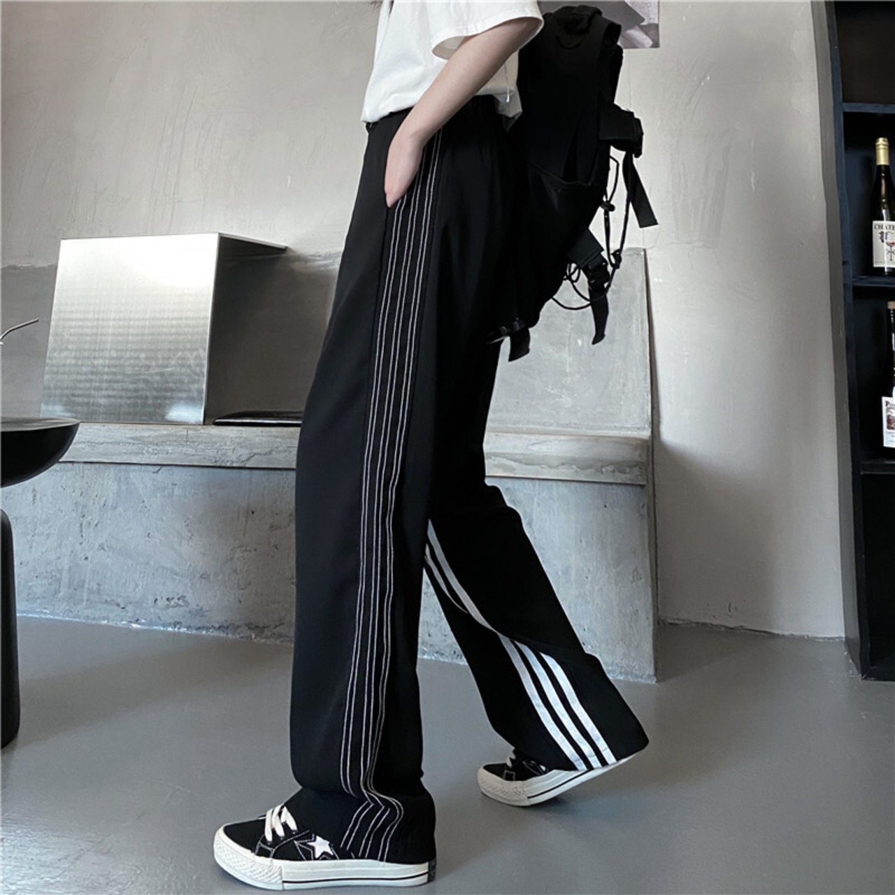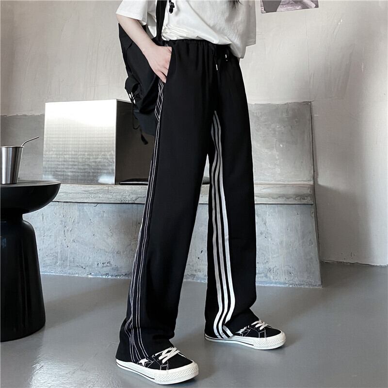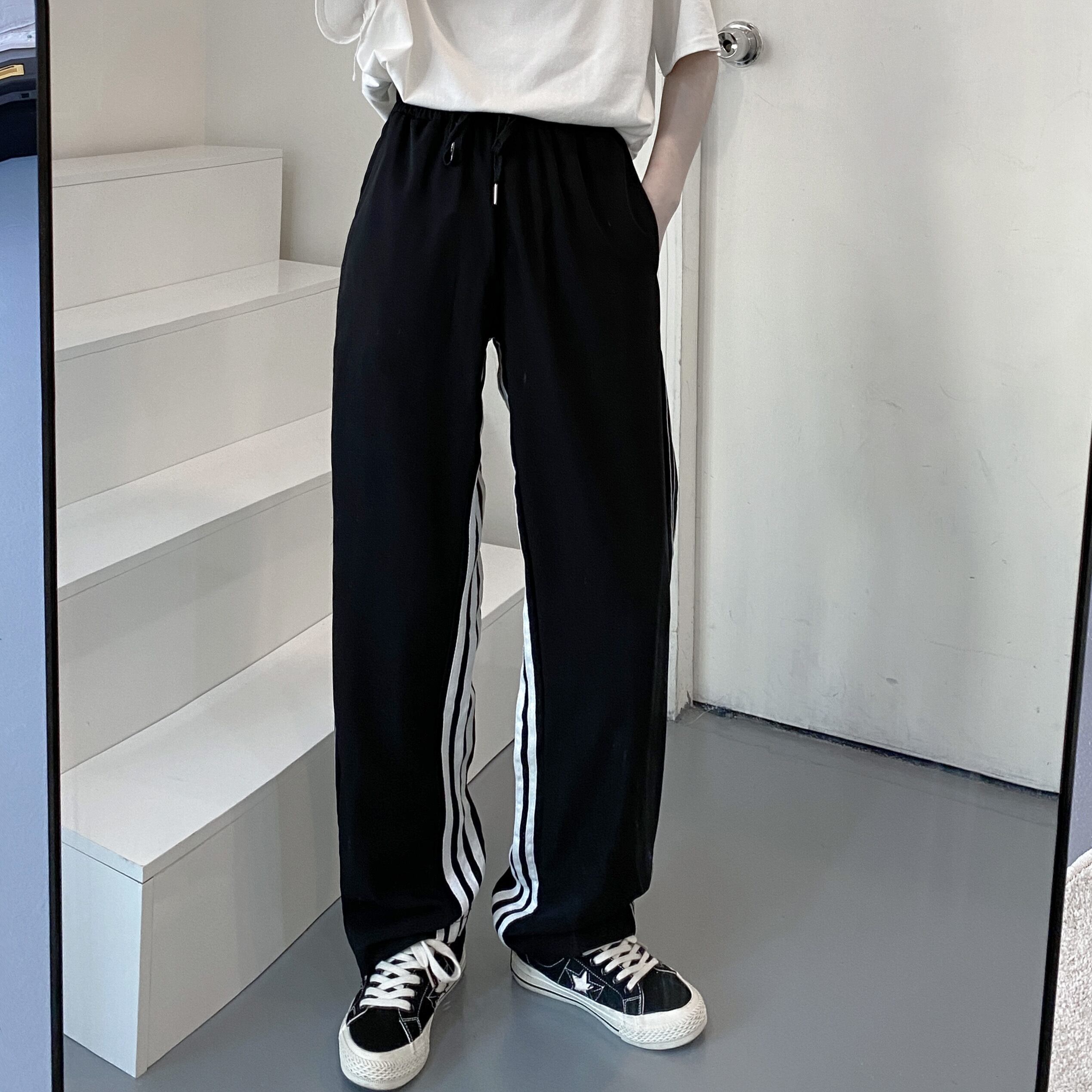 カジュアルパンツ レディース秋物韓国ファッションNEWスタンダードストライプブラックルーズハイウェストウェスト薄手ワイドレッグ レトロ オータム ワイドパンツ スタイル ウエスト Studios74254122817 | pLegLad Studios