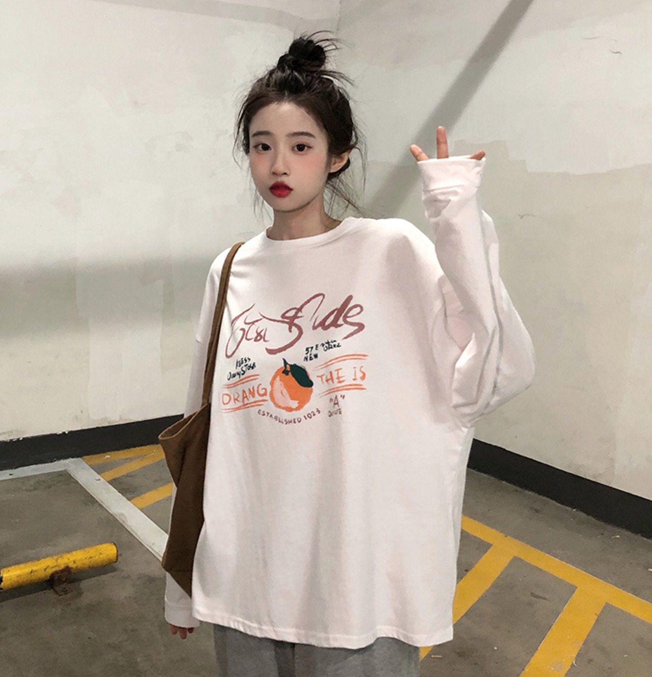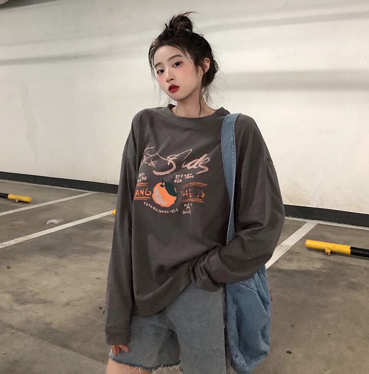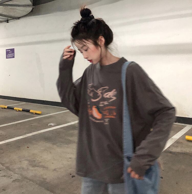 ラウンドネックゆったりシャツ レディース秋物韓国ファッションNEWスタンダードプリントルーズTシャツ ロング レトロ オータム Oネック ボーイズ スタイル 長袖 コーデ モノクロ Studio44656596046 | pLegLad Studios