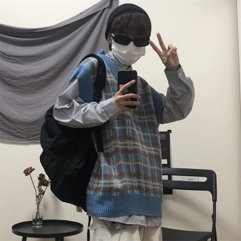 ルーズニットトップス レディース秋物韓国ファッション格子柄ジャカードVネックノースリーブセーター ジャケット オータム スタイル コーデ モノクロ Studio86316934010 | pLegLad Studios