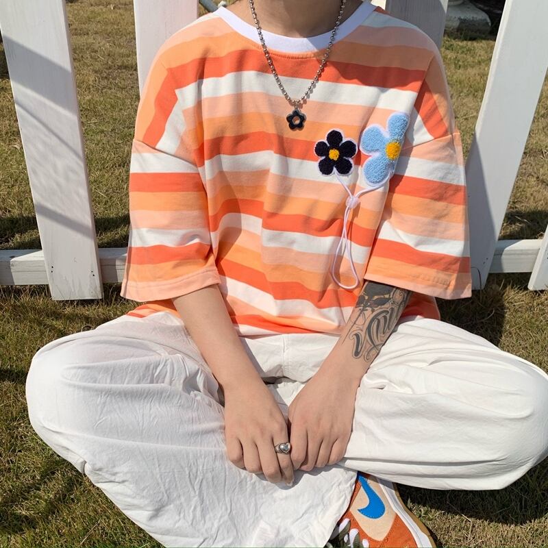Tシャツシャツ レディース夏服スタイル韓国ファッションNEWストライプルーズゆったり レッド 刺繍 夏物 フラワーデザイン コーデ モノクロ Studio83839274282 | pLegLad Studios