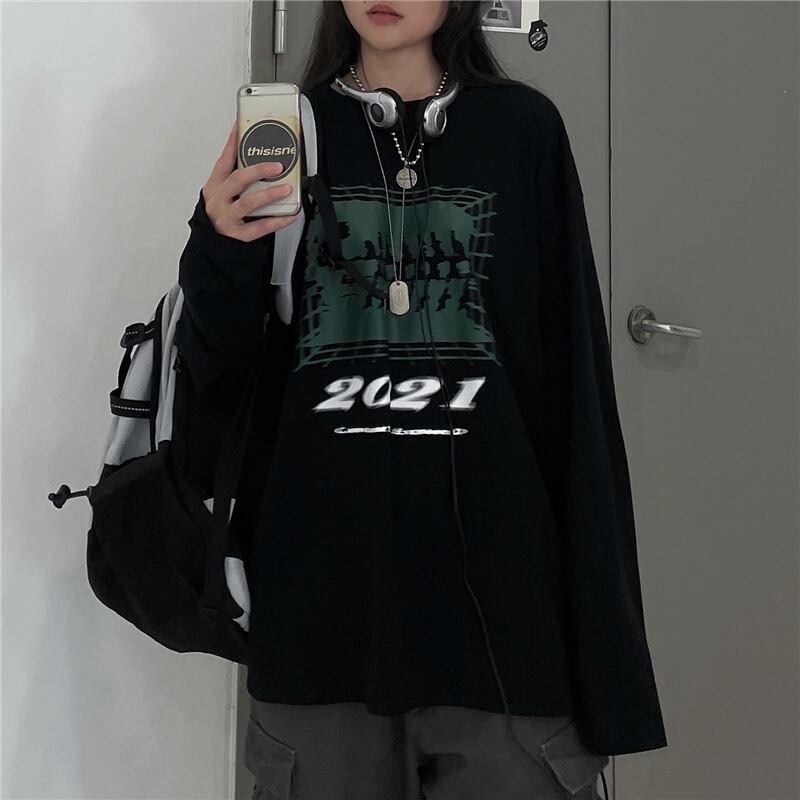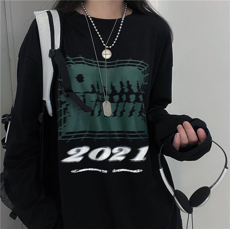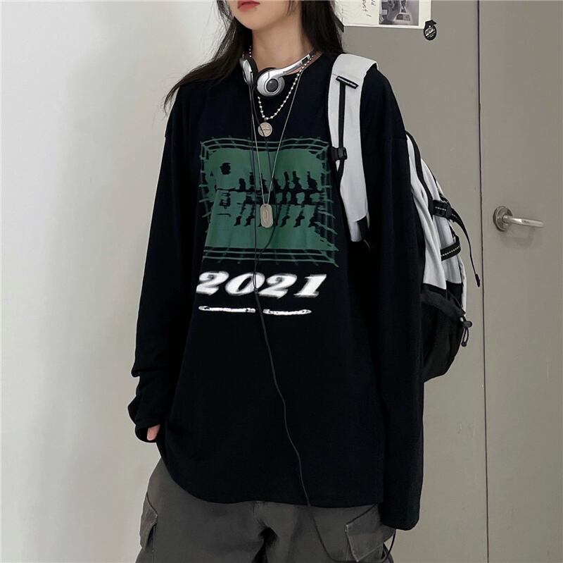 秋物スタンダードTシャツシャツ 韓国ファッションNEWダークプリントルーズレディースゆったり ロング レトロ オータム スタイル 長袖 コーデ モノクロ Studio39091041462 | pLegLad Studios