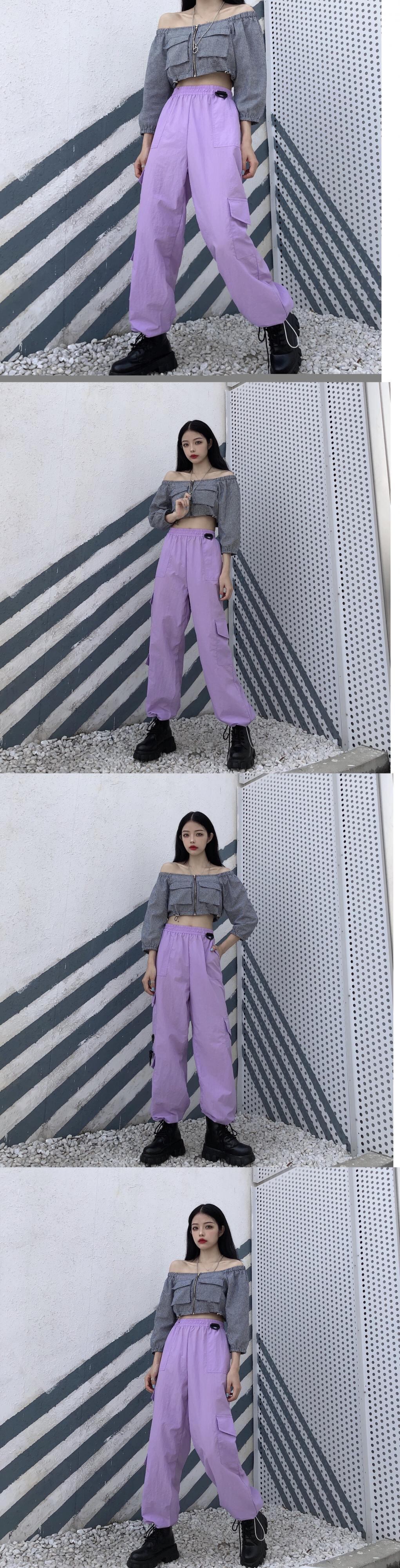 色:黒いズボン,パープルパンツ,チェック柄クロップトップ